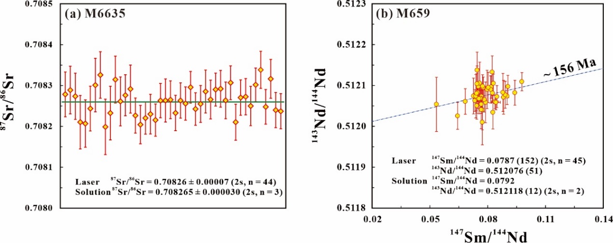 图2 (a) M6635符山石LA-MC-ICP-MS Sr同位素结果;(b) M659符山石LA-MC-ICP-MS Sm-Nd同位素结果