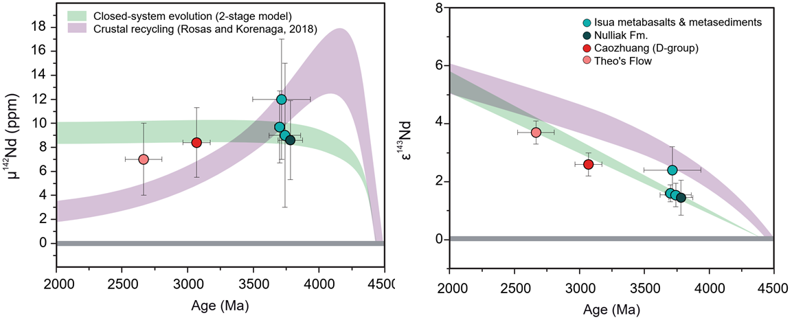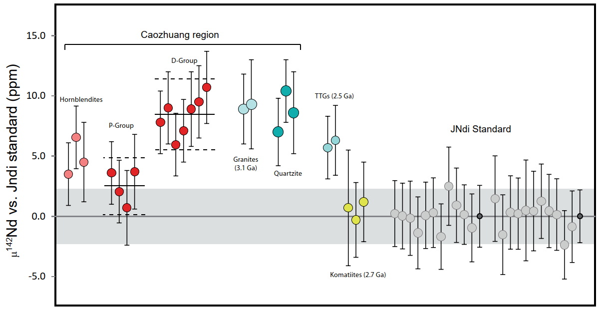 Sm-Nd同位素体系中,146Sm的半衰期仅有1.03亿年,这意味着146Sm在地球形成最初的5亿年就基本衰变完毕,因而地球样品中任何关于142Nd的异常都只能与冥古宙时期Sm-Nd的分异有关,也因此146Sm-142Nd等短周期放射性同位素体系适用于限定早期地球和其他类地行星的地幔演化过程。近二十年来,随着同位素分析技术的长足进步,各古老地体的142Nd数据日渐增多,迄今学界共提出多种理论用以解释现今观测到的数据分布规律,揭示冥古宙地幔-地壳的最终命运,这些代表性理论分别为:(1)太古宙晚期均一化模式;(2)冥古宙地壳快速生长-快速循环模式;(3)冥古宙地幔长期封闭隔离模式。然而,以往所使用的数据中,中太古代明显缺失,严重依赖始太古代数据,而始太古代数据又强烈不均一。对这些大量的始太古代数据进行分析显示,其标准偏差(2S.D.)与标样数据的标准偏差高度正相关,且一些极高正异常的142Nd数据并未在随后的研究中得到复现,因此始太古代高度变化的142Nd值可能仅仅是测试分析所致,并不能可信地指示早期地幔的高度不均一性。针对明显缺失的中太古代数据,他们对华北克拉通冀东曹庄地区的3.1Ga斜长角闪岩进行了142Nd分析,更新后的全球数据并未表现出142Nd异常随时间逐渐减小的趋势。因此,相比于“太古宙晚期均一化”和“冥古宙地壳快速生长-快速循环”等模型所作的推测,142Nd和143Nd数据分布更可能指示:冥古宙亏损地幔可从4.4Ga一直封闭保存至2.7Ga,在此期间不受或较小受到地幔对流均一化的影响。