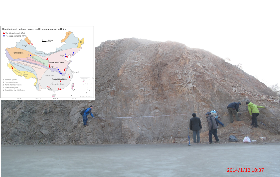 图3 华北克拉通冀东地区曹庄剖面。某种程度上也可以说,曹庄可能记录了44亿年前月球形成时的那次大碰撞激荡宇宙的壮丽余晖。插图为中国境内的古老岩石和古老锆石分布 (Liou et al., 2023)