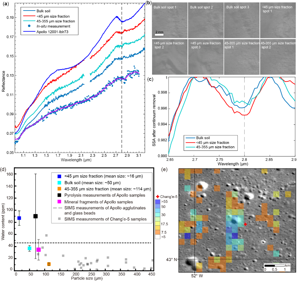 月壤颗粒大小和含水量之间的相关性有助于区分不同的水源。太阳风注入到月壤中的水显示出与比表面积的相关性,而来自月球本身或彗星的水却没有。因此,通过比较嫦娥五号月壤细粒和粗粒部分的含水量,可以表征月球风化层中水的主要来源。结果表明,月壤的细粒部分的水含量更高,指示太阳风注入是月表水的主要来源,这一发现为月壤中水的主要来源提供了统计证据(图2)。实验室、月表原位和卫星遥感光谱的月壤水测量结果非常一致,说明该项研究的结论能够很好的代表月面的真实情况。
