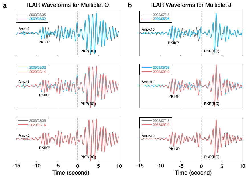 重复地震是指几乎在同一个位置发生、震级接近,同时震源机制几乎一样的地震。这样的重复地震在同一台站上的记录几乎完全一致(图2)。他们通过对比发现,当地震波没有通过内核的时候,重复地震在YKA和ILAR台阵上的记录几乎完全一致;但是内核存在差速旋转,不同时间发生的重复地震辐射的地震波经过内核时的路径会发生变化,从而会引起地震波到时和波形的变化。特别是穿过内核的地震波PKIKP(见图1a)的尾波,它是由内核中分布的小尺度异常体的散射所产生(Wang and Vidale, 2022),其波形受路径上介质变化的影响尤为显著,对于内核差速旋转也更加敏感(图2)。反之,如果地震对的PKIKP和其尾波的波形一致,则PKIKP经过内核的路径几乎一样,进一步得知内核处在完全相同的位置。