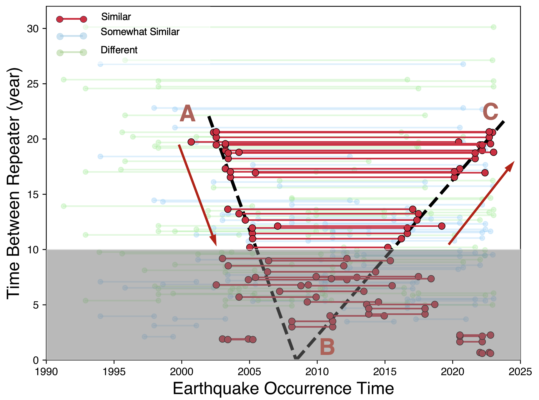 图3 重复地震波形相似性比对图。直线连着两个地震对,红色代表着波形完全一致的地震对