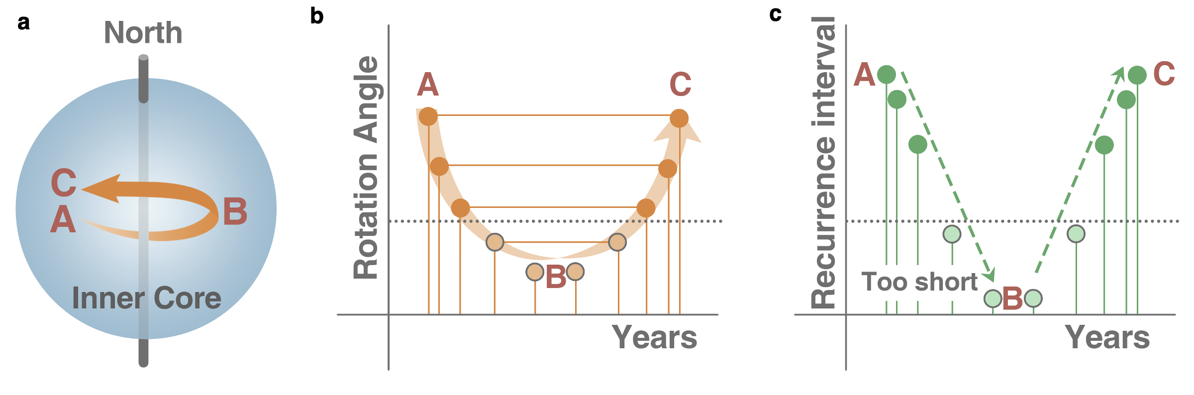 通过分析重复地震对的PKIKP和其尾波波形相似性随时间的分布规律,发现记录相同波形的重复地震对中,第一个地震在2003-2005年和对应的第二个地震在2015-2023之间的重复地震对之间间隔时间随着时间推移逐渐变短(图3和图4c),基于此,他们推测出内核处于振荡状态(图4)。通过线性拟合发现,内核大约在2008年左右相对改变旋转方向,且两个时间段的旋转速率不同,即内核在2003至2008年之间超速旋转(super-rotate)和2008年至2023年之间的慢速旋转(sub-rotate),同时超速旋转速率大约为慢速旋转的2~3倍。