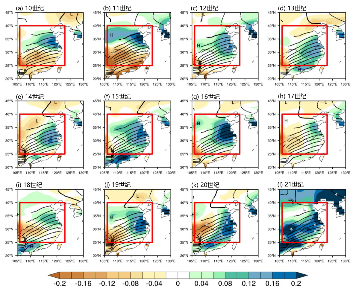 图2 10世纪至21世纪东亚夏季风降水空间模态特征(利用降水和850hpa位势高度的联合经验正交函数分解来表征东亚夏季风空间主要模态)。红框(25°–40°N,106°–123°E)表示我国东部的降水区域