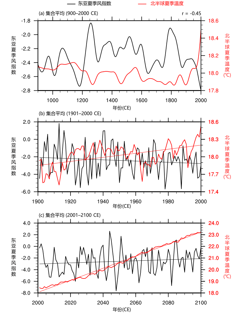 地质历史时期轨道长尺度古气候研究表明,东亚夏季风与北半球夏季温度变化的关系是冰期(冷期)东亚夏季风弱,而间冰期(暖期)东亚夏季风强。然而,由于受到长尺度气候代用记录分辨率不高以及气候仪器观测记录太短的限制,百年短尺度东亚夏季风与北半球夏季温度变化的关系至今仍不清楚。最近公布的过去一千年气候模式模拟结果,以及东亚夏季风和北半球夏季温度变化的集成序列为回答这一问题提供了机遇。