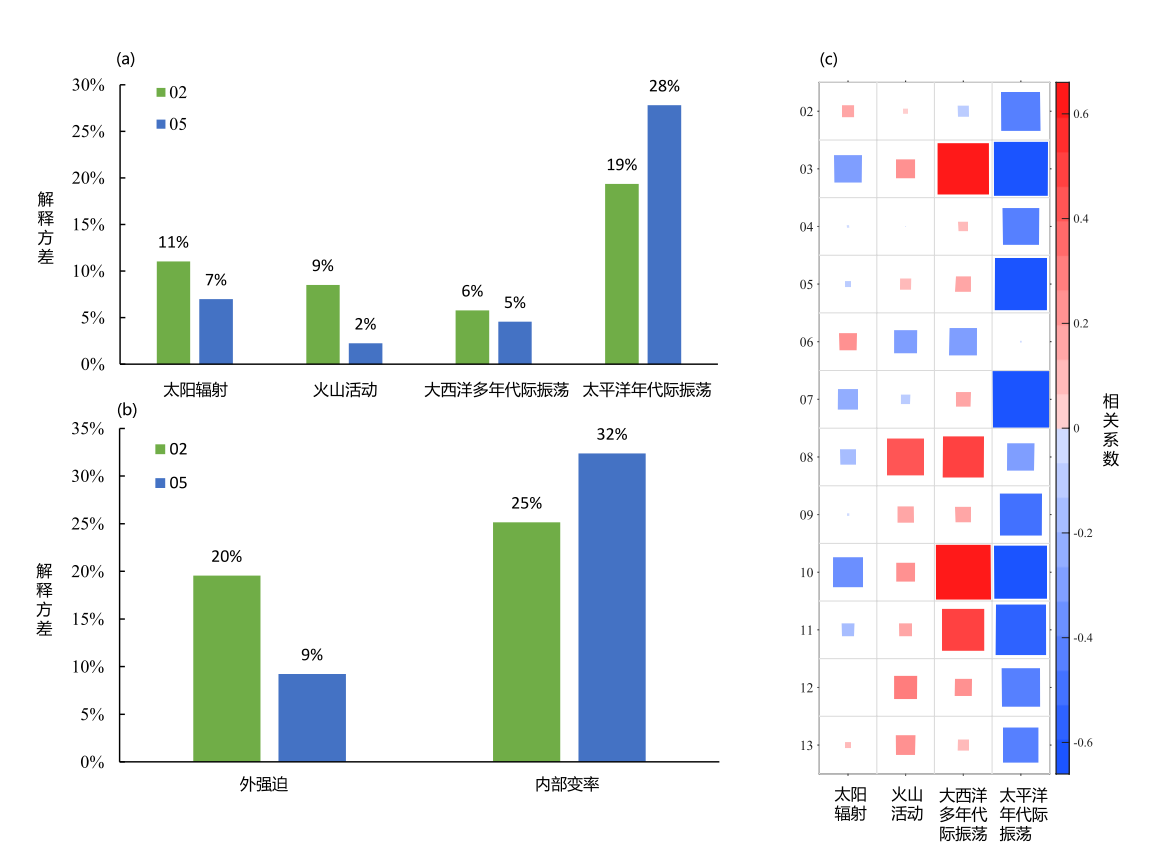 进一步定量化评估外强迫和内部变率对东亚夏季风百年尺度变化的相对贡献,结果表明尽管外强迫对东亚夏季风百年际变化有影响,但其影响程度相对有限;相比之下,内部变率的贡献更大,其中太平洋年代际振荡的作用尤为突出(图3)。已有研究表明,太平洋年代际振荡会影响热带印度洋和太平洋海区的海表温度,通过东亚-太平洋型遥相关,影响东亚夏季风的变化。