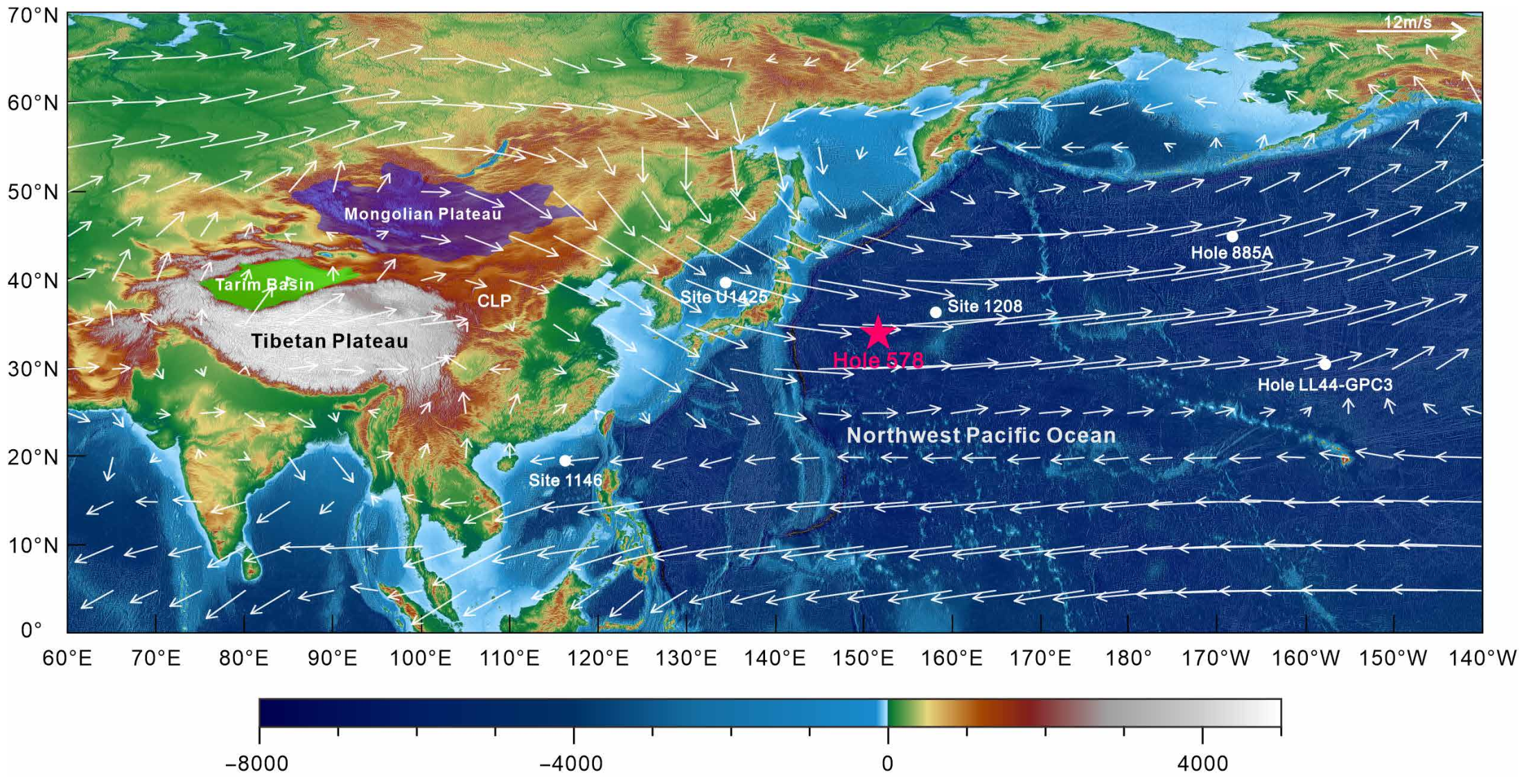 探索地质历史时期东亚冬季风的演化特征和驱动机制对于理解未来冬季风活动规律具有重要指导意义。目前对于地质历史时期东亚冬季风研究的时间尺度主要集中在第四纪以来。前人对于这一尺度东亚冬季风的演化特征和规律的研究程度较为成熟,但对于更长时间尺度的冬季风演化历史还存在较大的研究空间。晚中新世期间全球气候和构造格局发生了一系列显著变化,这为探索东亚冬季风演化与全球变化和构造运动的关系提供了重要的时间窗口。已有的晚中新世东亚冬季风重建记录主要集中在中国黄土高原和东亚大陆边缘海(例如:中国南海、日本海等)。为了进一步约束晚中新世东亚冬季风演化历史和驱动机制,800彩票古地磁与年代学实验室大洋岩石圈课题组张强副研究员联合国内外多家研究机构对西北太平洋DSDP 578岩心晚中新世沉积物开展了系统的环境磁学、沉积学和地球化学研究,基于多指标重建了晚中新世东亚冬季风演化历史,同时结合古气候模拟系统评估了全球气候变化和构造运动等因素对晚中新世东亚冬季风演化的调控作用。