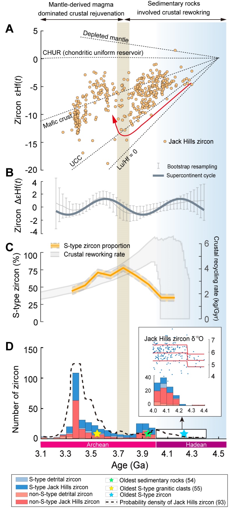 研究团队运用该模型对Jack Hills碎屑锆石进行预测分类,结果显示Hadean时期的S型锆石的比例达到了35%,这些锆石的年龄可追溯至地球形成后的几亿年内。这一发现表明,早在地球历史的早期阶段,地壳的风化、沉积岩的形成、沉积物的埋藏和再循环过程可能就已经开始。Jack Hills锆石中S型锆石的比例在4.1Ga-3.8 Ga之间从30%增长到80%,与εHf显示下降趋势存在一致性(图3)。而在3.8Ga-3.4 Ga之间,S型锆石的比例则从80%降低到40%,指示岩浆源区镁质成分的加入(图3)。这种成分的转变,表明从大陆地壳重熔到镁质岩浆作用的过渡,对应着地球早期的造山运动过程。