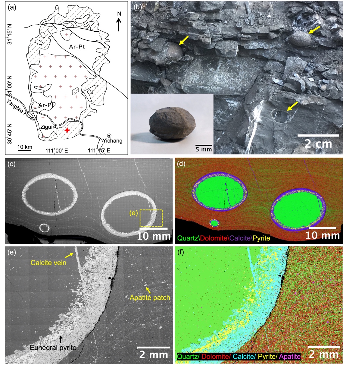 湖北宜昌三峡九龙湾剖面埃迪卡拉系陡山沱组发育完整、出露连续、变质程度低,是开展该时期古环境、古生物与地层学研究的理想剖面(图1a)。该剖面陡山沱组二段下部的黑色页岩中广泛发育大量的硅质结核(图1b)。基于扫描电镜的大面积自动矿物分析结果显示,硅质结核由三部分组成(图1c-图1d),从内到外依次是:石英核,自形黄铁矿边及方解石外缘;结核周围的围岩由层状白云石、石英和粘土矿物组成,含少量方解石、磷灰石和黄铁矿。结核围岩的微纹层厚度从几十微米到几百微米不等,并围绕结核弯曲展布(图1e-图1f),表明结核在早期成岩过程中固结,因此有效地抵抗了后期的成岩改造和压实。