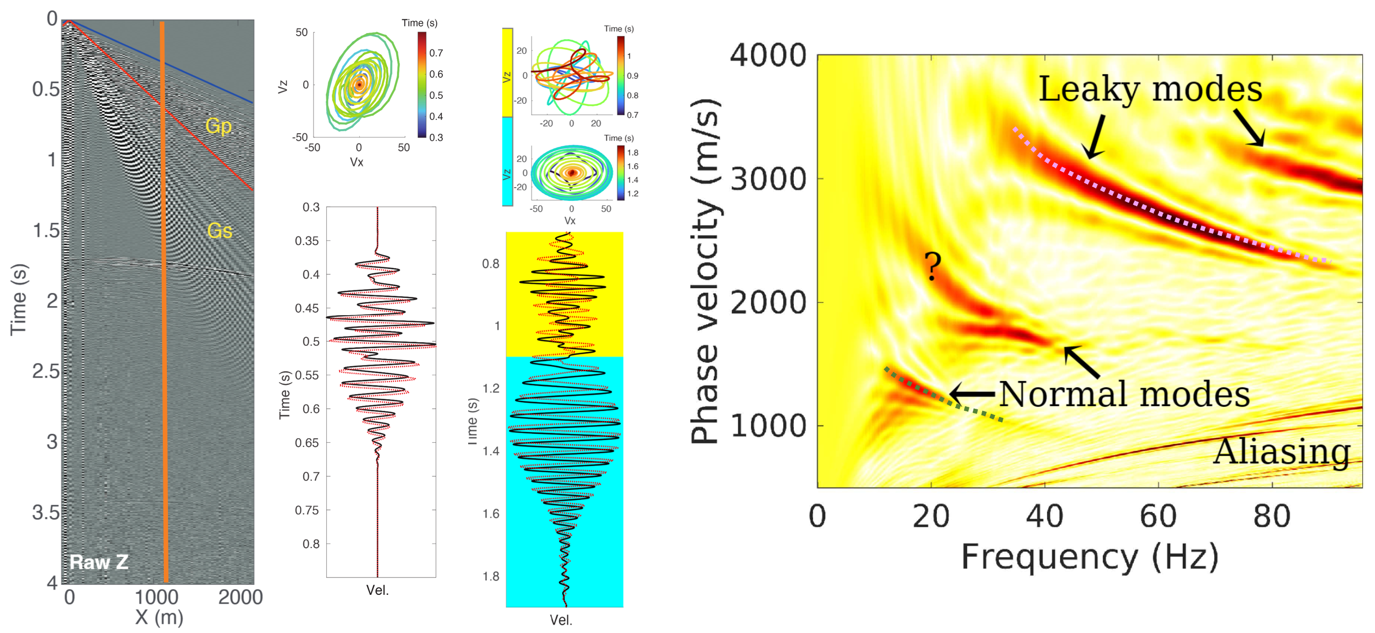 图1 采集于西南极冰盖的主动源地震波形数据和对应的频率-相速度谱。地震面波由于频散其时间域波形十分复杂,采用波形反演方法极容易陷入局部极小值;所对应的频率-相速度谱较波形有更简单的形式,同时也保留了用于约束速度反演的关键频散信息