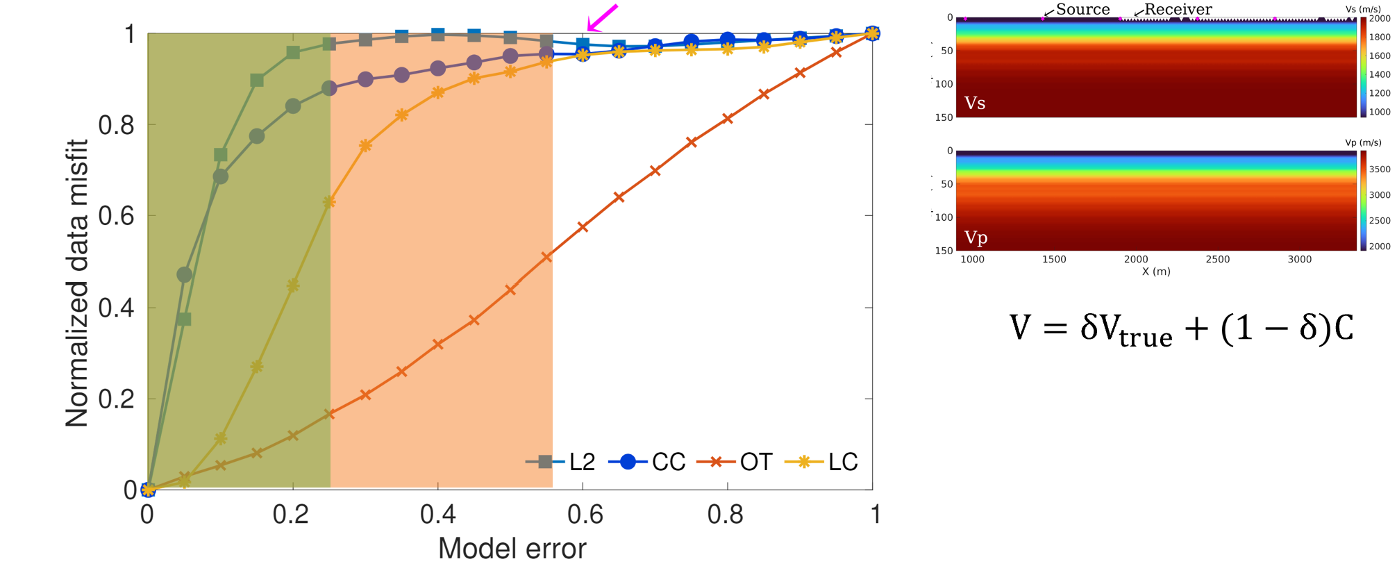 800彩票深层油气理论与智能勘探开发重点实验室张振东特聘研究员、刘伊克研究员联合沙特阿卜杜拉国王科技大学Tariq Alkhalifah教授,提出了波动方程地震面波全频散谱反演方法。该方法将传统一维面波频散曲线反演方法和最新的地震全波形反演理论相结合,通过数值方法求解弹性波波动方程模拟地震面波在任意复杂介质中的传播过程,避免了传统方法对地下结构的层状模型近似;将复杂的地震面波波形变换到保留其频散特征的频散谱域进行数据比较(图1),避免了拾取频散曲线且可以自动利用各阶频散信息;提出了频散谱相减、频散谱全局互相关、频散谱最优输送和频散谱局部互相关四种目标函数,比较了不同目标函数的凹凸性、找到了一种全局最优目标函数(图2)。借助全波形反演统一理论框架,使用伴随状态法计算速度模型梯度和局部优化算法迭代更新速度模型,可实现大规模地震资料的自动处理。该反演思想可推广至一般反问题,即将复杂的地震波形变换到保留其主要特征的简单空间(如神经网络的隐空间)进行比较,降低反演的非线性。随着油气、地热、二氧化碳封存等陆地勘探目标的涌现,该方法有望为陆地和浅海探区高精度速度建模提供一种新的解决方案。