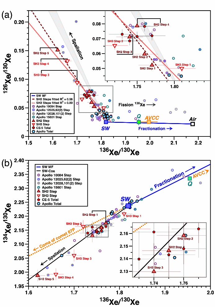 在嫦娥五号月壤中,彗星和陨石组分混合比为3:1(图4)。根据氙同位素估计,彗星组分在嫦娥五号月壤中的总占比大约为3%-7.5%。这些外源性组分的添加有效调和了月壤中观察到的氪和氙同位素相对太阳风存在未知分馏的矛盾,同时为太阳风氩/氪/氙元素比的长期恒定性提供了新的见解。