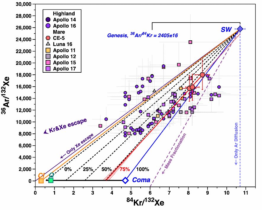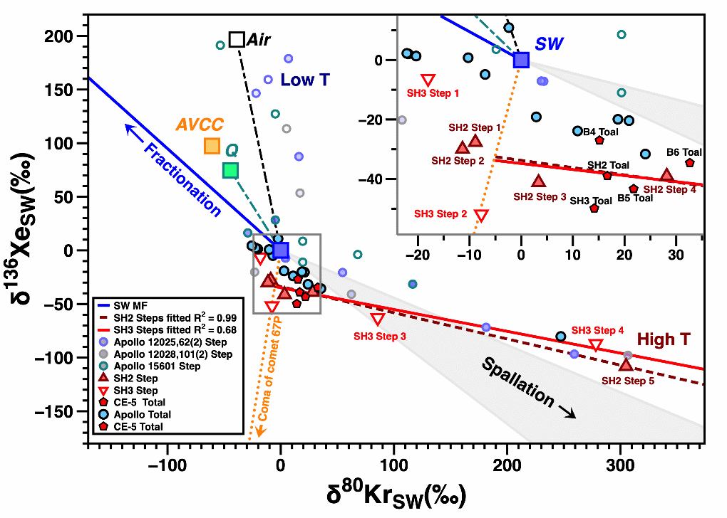 研究者还首次尝试将这些外源性组分的添加纳入到月壤中氪同位素的分馏机制的解释中,对比表明,氪和氙同位素具有很强的相关性(图3)。证明了月壤中氪和氙的同位素分馏与变化与早期地球大气逃逸的输送、彗星和陨石组分不同比例的混入相关,显著改变了月壤氪和氙的同位素组成。