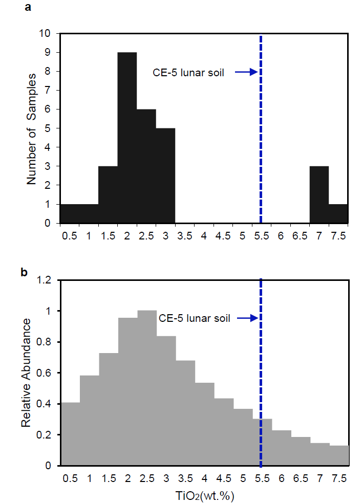 图1(a)嫦娥五号月壤TiO2含量相比于目前所有月海玄武质模拟月壤的分布;(b)月球正面月壤TiO2含量分布直方图