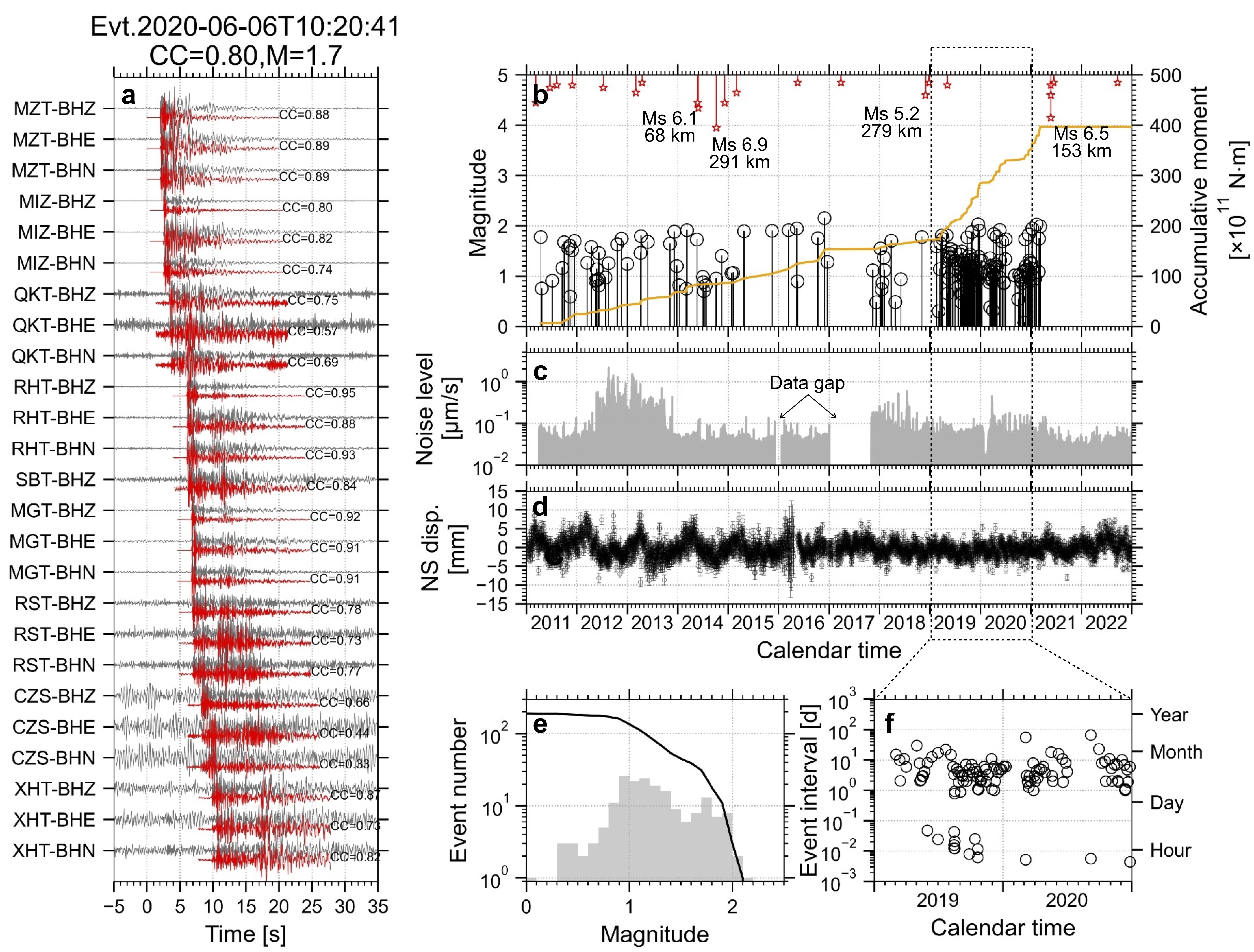 图2 深部低频地震事件的活动性。a.模版匹配算法探测到的事件案例(红:模板,黑:连续波形资料);b.深部低频地震事件的大小随时间的变化;c.在研究频段内的背景噪声随时间的变化;d.GNSS南北向位移时间序列;e.深部低频地震事件的大小-个数分布;f.深部低频地震事件在2019-2020年间的复发间隔时间