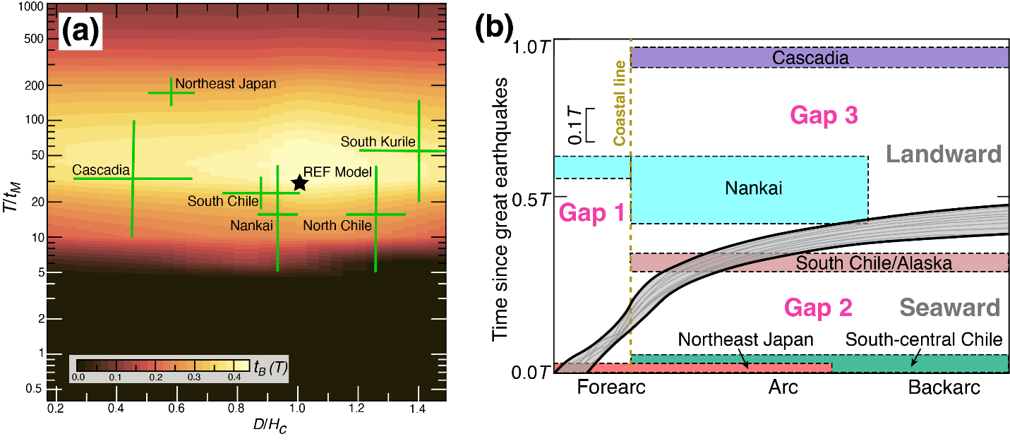 图2(a)震后持续时间(tB)受控于时间相关参数(T/tM)和空间相关参数(D/Hc)的相图;(b)全球俯冲带地震周期观测时空空白(Gap1-3)