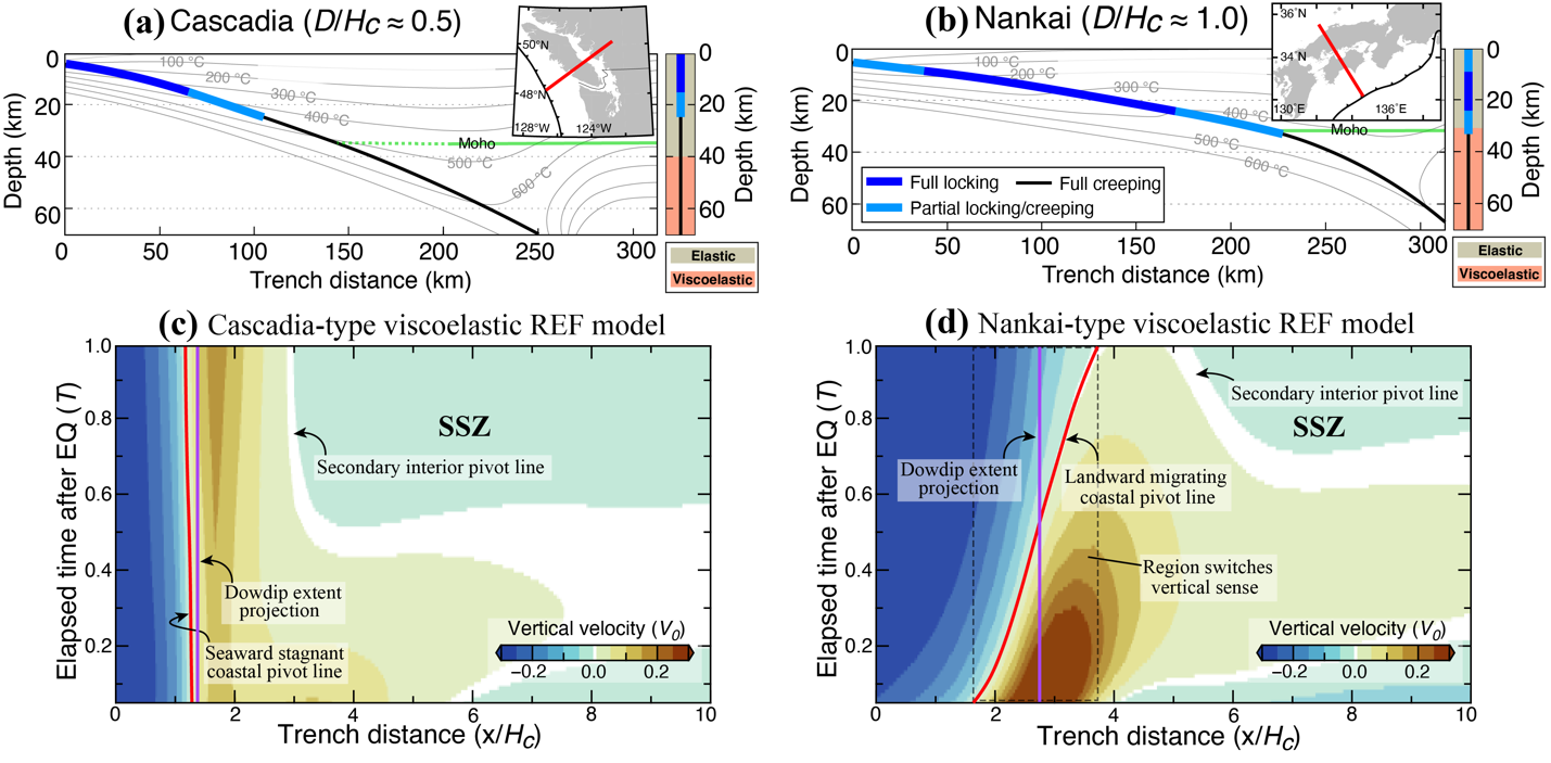 图3(a-b)Cascadia和Nankai热力学结构和相对闭锁深度(D/Hc);(c-d)数值模拟的Cascadia和Nankai两类俯冲带垂向地震周期形变