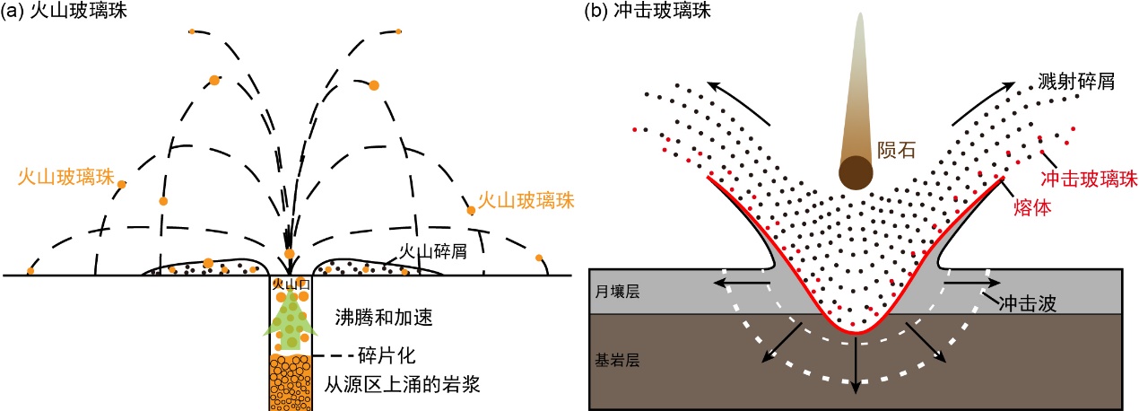 图1 火山玻璃珠和冲击玻璃珠的形成模式图