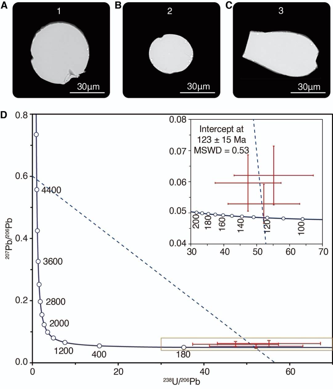 这三颗火山玻璃的U-Pb同位素体系定年结果为123 ± 15 Ma(图4)。结合以下特征:(1)三颗玻璃珠相对完整,仅第三颗是发生了脆性断裂,没有被显著冲击改造的痕迹;(2)三颗玻璃珠的Rb含量显著高于其他冲击玻璃珠,没有发生Rb的显著丢失,指示类似挥发性的Pb也没有受到显著影响;(3)三颗玻璃珠具有硫同位素显著偏负的特征,因为撞击导致丢失的过程会使得硫同位素向偏重的方向分馏,排除其受冲击改造的影响。因此,测量的年龄就是三颗火山玻璃的形成时间,代表了月球上存在这一期的火山作用。