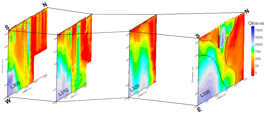 在大量样品实验室测定分析和浅层电阻率剖面地质露头对照统计的基础上,确定白云鄂博稀土白云岩包括中低品位铁矿稀土白云岩具有中高阻电性特征(李亮等, 2024),为白云鄂博矿区电磁法探测数据解释提供了岩石物理依据。在不同反演方法对比的基础上,通过与矿床地质与钻探结果的对比优选AMT反演方法。矿区尺度AMT反演结果揭示了白云鄂博矿区电性结构特征(图1):整体可分为南部高阻带(D1)、北部低阻带(D2)和中部过渡带(D3);北部低阻带对应厚度巨大白云鄂博群裂谷沉积,南部高阻带白云鄂博基底杂岩和变质岩,局部对应成矿后侵入的花岗岩;白云鄂博稀土矿床位于中部过渡带(图1)。矿床尺度加密测点(点距20米)AMT反演剖面(图2)与三维成像结果(图3)清晰揭示白云鄂博“Y”型控矿构造特征,矿床在浅部被低阻板岩分割成南北两个矿带,南矿带局部矿体(稀土白云岩)与围岩交错发育。结合矿床地质以及矿区的地震勘探资料综合分析认为白云鄂博矿床的构造背景为克拉通边缘裂谷,岩浆由北向南高角度侵入白云鄂博群,北部厚层沉积为矿体的保存提供保护隔层。