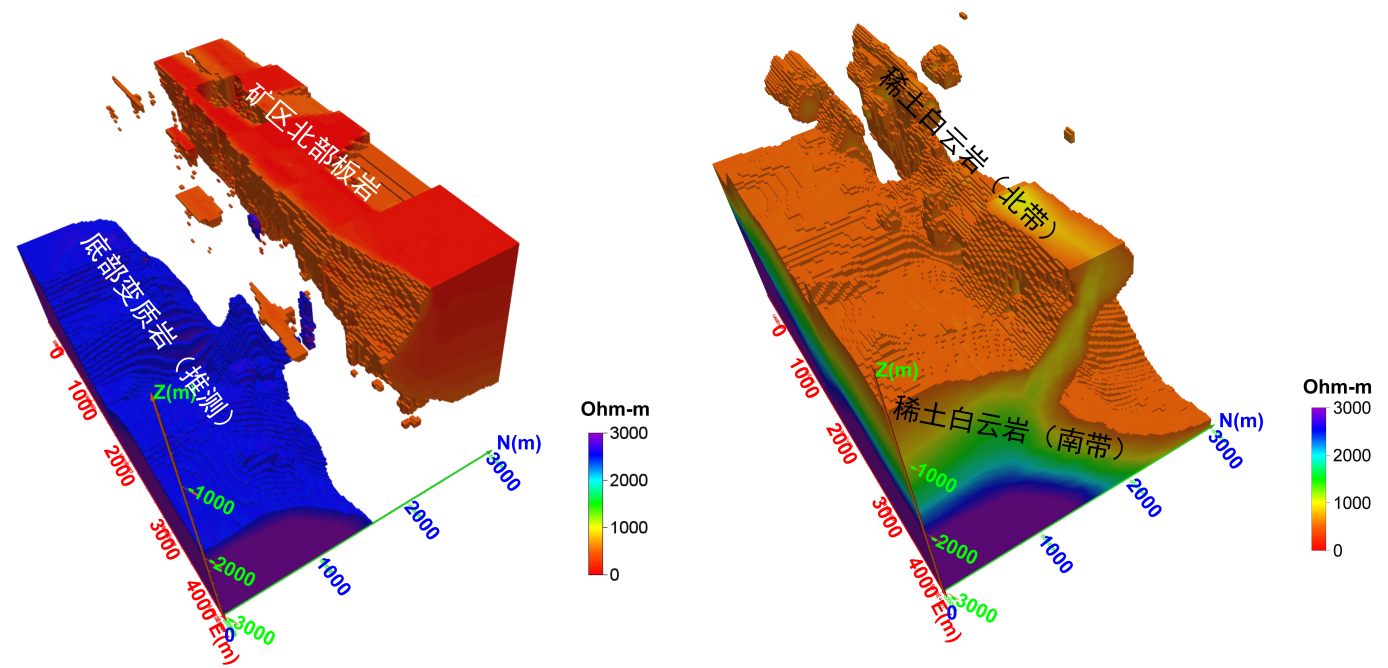 图3 白云鄂博矿床三维电阻率渲染图(左. 围岩电阻率渲染图;右. 矿床电阻率渲染图)