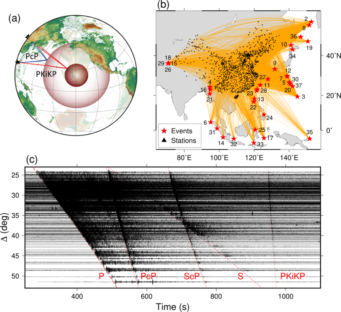 中国科学院地质与地球物理所地球与行星物理学科中心博士毕业生章浩东与博士生崔天宇、导师艾印双研究员利用中国数字地震台网2009-2018年期间记录的1014个宽频带地震台站数据,拾取到4272条具有清晰地球内外核反射震相对(PcP和PKiKP)波形记录(图1),分析了地核反射震相的走时残差分布和波形相似性,获得了东亚地区下方内核边界精细结构的新认识。