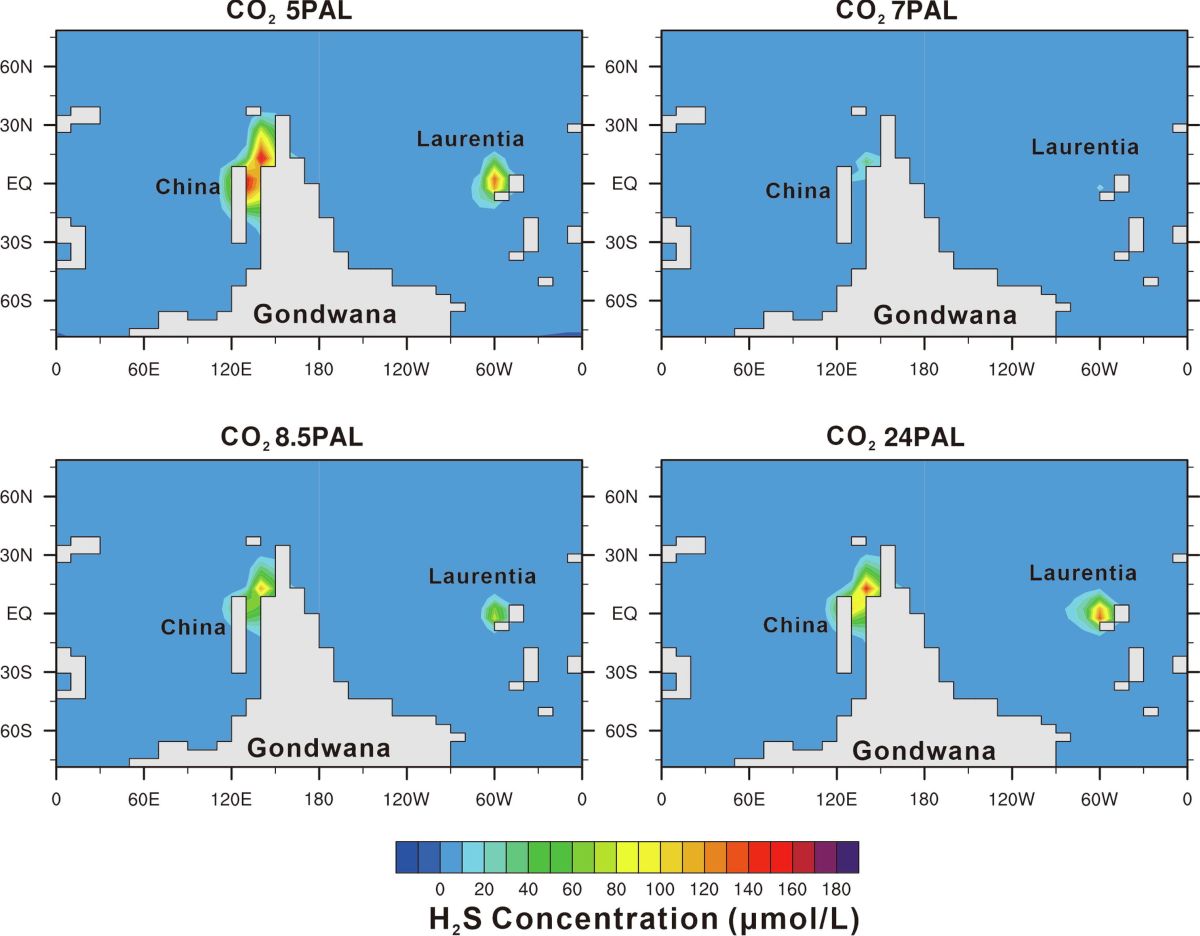 图2 cGENIE模型下显示的中晚奥陶世转折期间,不同大气pCO2水平下表层海水(深度127.55米)中H2S浓度的全球分布(PAL:当前大气水平)