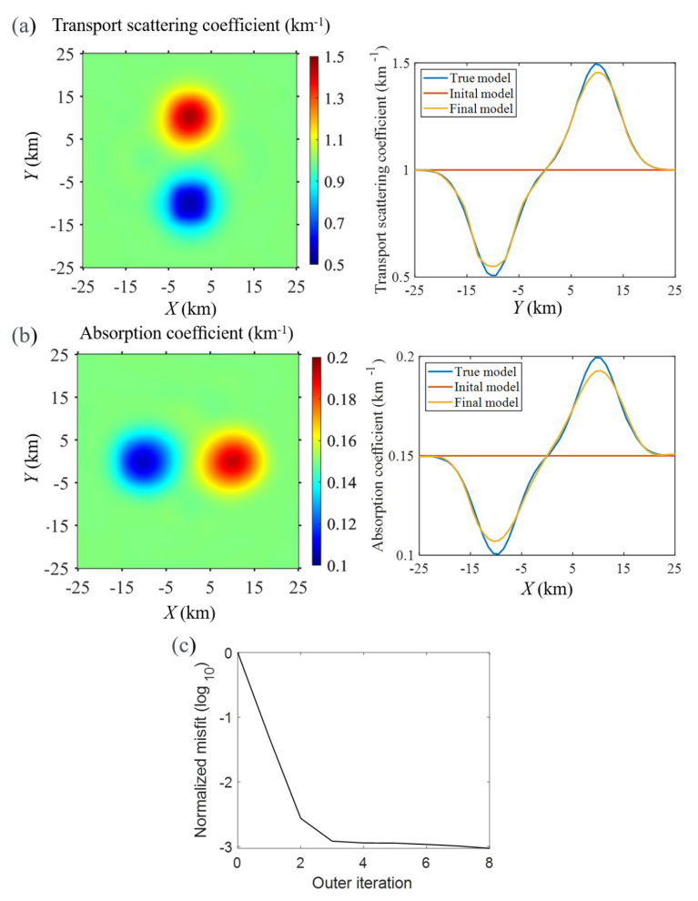 图2 高斯异常模型的传输散射系数(a)和吸收系数(b)的同时反演结果。在反演过程中使用了满足频率选择准则的0.008 Hz、0.01 Hz和0.012 Hz等频率的能量数据;(a)和(b)的右侧分别展示了穿过异常区域中心的剖面图;(c)为反演过程的收敛曲线