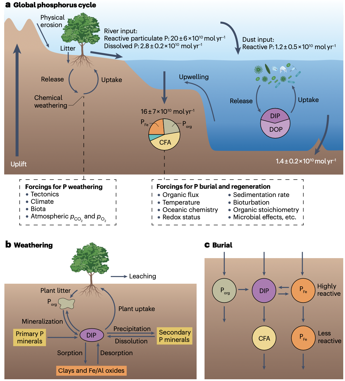 图1 全球磷循环示意图。a.全球磷循环,包括环境强迫。通量值为工业革命前时期的;b.磷风化过程;c.磷在海洋沉积物中的主要埋藏路径。DIP-溶解无机磷;DOP-溶解有机磷;CFA-碳酸氟磷灰石;Porg-颗粒有机磷;PFe-铁氧化物/氢氧化物结合的磷