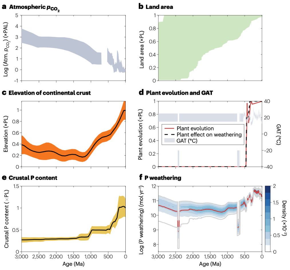 基于各种驱动因素的影响,800彩票的研究团队量化了磷风化的演化。计算结果表明,在过去的30亿年中,陆地磷风化总体上逐渐增加 (图3)。初步估算显示,由于构造(如大陆的面积、海拔和磷含量)、大气成分、气候和生物群体等长期驱动因素的变化,磷风化在不同时间段发生了变化。根据大陆面积的演化,磷风化的通量可能在约30亿到25亿年前有所减少,这一时期大气CO2分压的逐渐下降可能导致了这一变化。大气CO2分压变化可能会影响土壤pH值,进而影响磷矿物的溶解速率。在新元古代早期(约10亿到8亿年前),由于大陆地壳的海拔和磷含量增加,磷风化增至现代水平的15%到17%。然而,在古元古代和新元古代的雪球地球时期,由于全球平均温度(GAT)极低(低于-20到-30°C),陆地磷的风化速率可能显著减少。由于高等植物的出现和大陆地壳磷含量的增加,奥陶纪以后全球的磷风化显著增强。除了陆地的磷风化,海底玄武岩洋壳的风化在前寒武的缺氧时期有可能向海洋中输送了大量的磷。