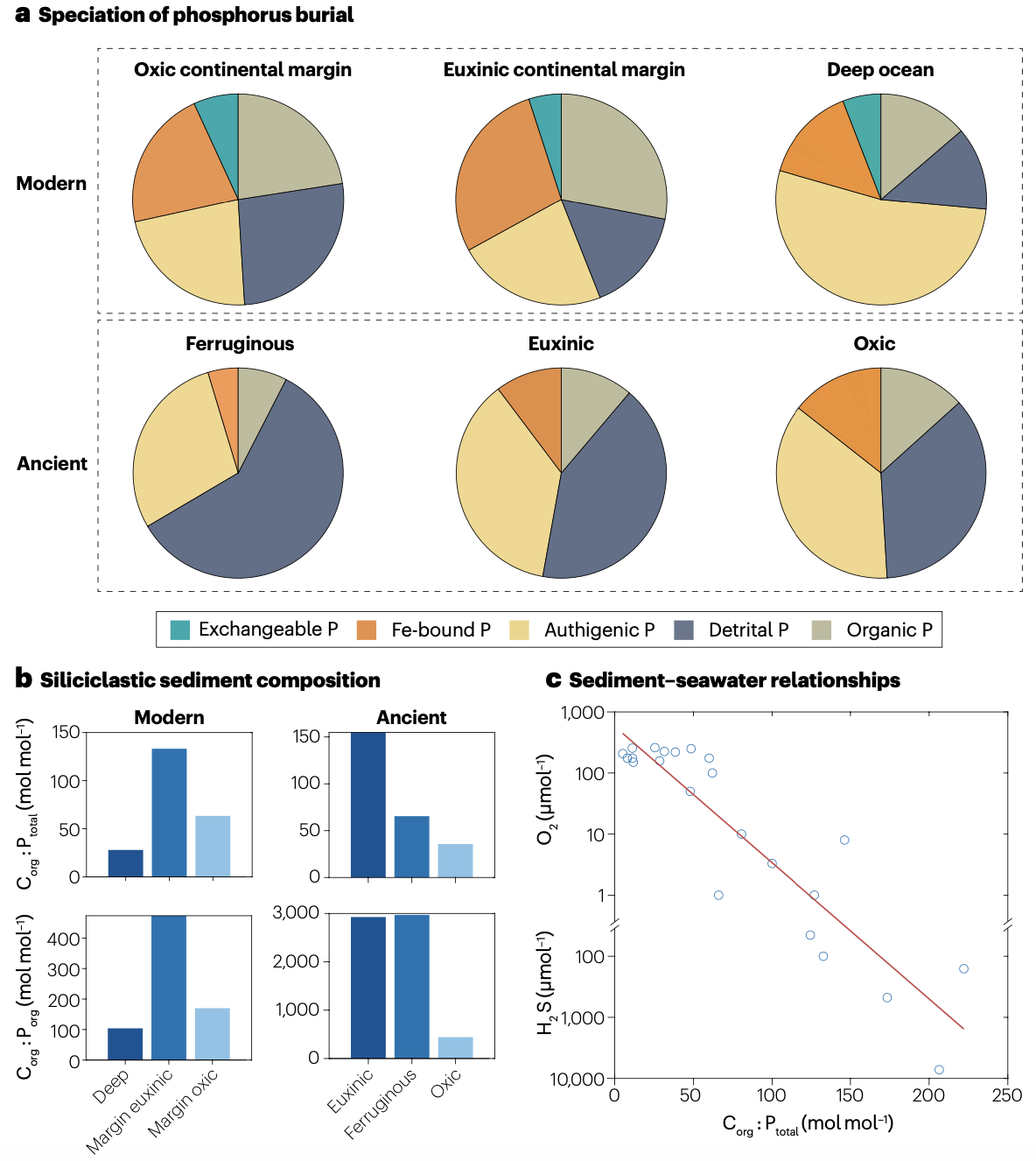 图4 不同海洋环境下的磷埋藏。a.现代和古代环境中的磷埋藏组分变化;b.现代和古代环境中硅碎屑沉积物的有机碳与总磷(Corg/Ptotal)比值和有机碳与有机磷(Corg/Porg)比值;c.现代海洋底层海水中溶解氧(O2)和硫化氢(H2S)浓度与平均Corg/Ptotal的关系。红线表示线性拟合