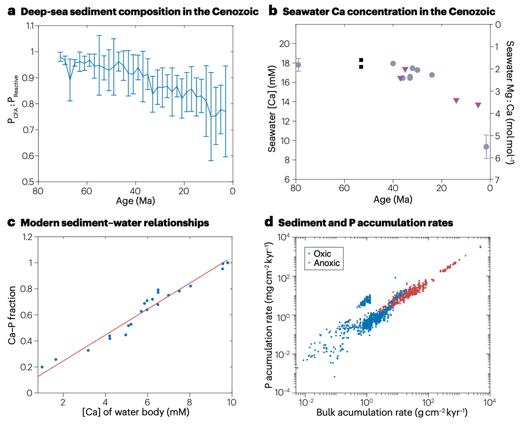 图5 海水钙浓度和沉积速率对磷埋藏的影响。a. 在新生代海底沉积物中碳酸盐氟磷灰石(CFA)埋藏比例(相对于总高活性磷)的变化;b. 新生代海水钙浓度演化;c. 现代河口-海洋沉积物中钙磷(Ca–P)比率与底层水钙浓度的关系;d. 氧化和缺氧海洋环境中沉积物的整体积累速率与磷积累速率的关系