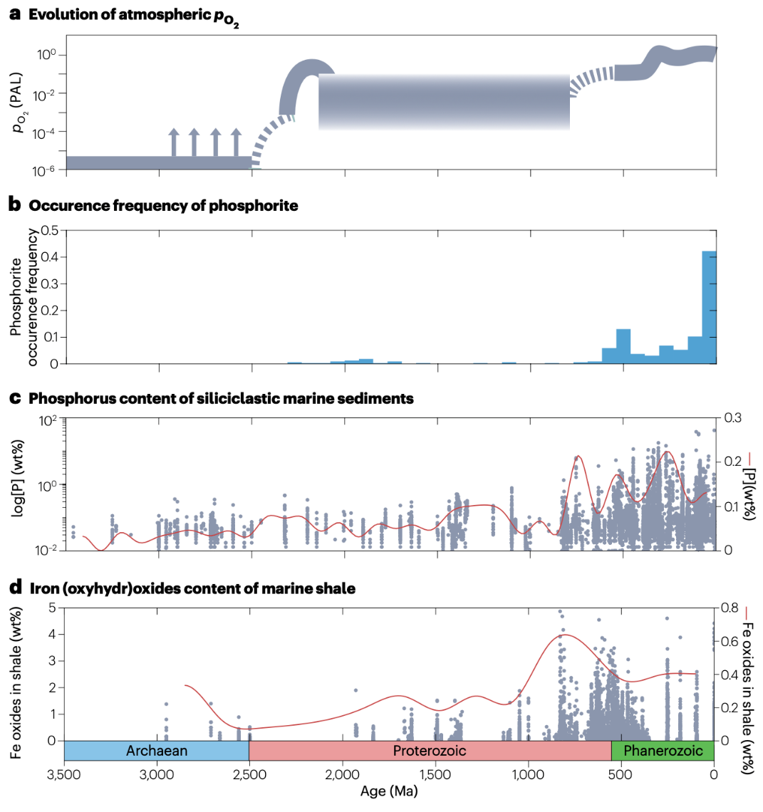 估算磷埋藏通量在地球历史中的变化非常困难,原因在于沉积记录的不完整性以及沉积速率估算的误差。数据证据表明,从托尼安期(约8亿年前)到新元古代,硅质碎屑海洋沉积物的平均磷含量显著增加(图6)。然而,另有证据表明,新元古代到早古生代沉积岩的磷含量中位数并未发生显著变化。尽管如此,硅质碎屑海洋沉积物磷含量的潜在变化大致与新元古代氧化事件以及海相页岩中铁氧化物含量的增加相吻合。对此碎屑沉积物磷埋藏变化的解释包括新元古代以前的条带状铁建造捕获海水中大量的磷、大陆地壳磷含量的变化和真核生物的兴起。海洋沉积物中磷与铁氧化物/氢氧化物含量的共变化支持了这种变化可能由大气–海洋氧化还原状态的变化引起。铁结合的磷可能对大陆边缘沉积物中磷含量增加起到了重要作用。另外,磷块岩沉积在太古代不存在,在大氧化事件之后才出现(图6)。对此的解释包括,大氧化事件伴随陆地磷风化的增加,为磷块岩提供了磷的来源;大氧化后海水硫酸根增多,硫循环增强,绿硫细菌繁盛,促进了磷灰石的形成;以及太古代海水pH值低,使磷灰石无法在海水-沉积物界面形成。