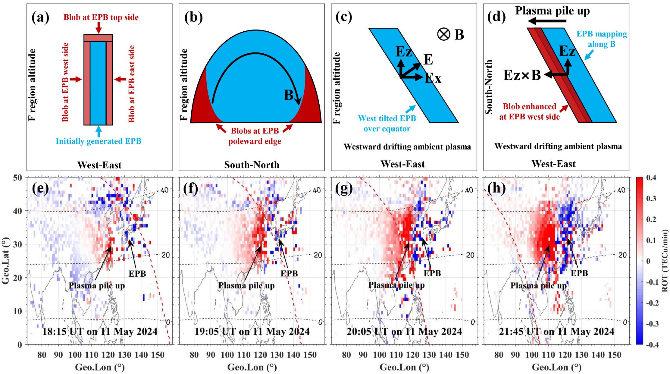 图3 (a-d) EPB的产生及演化调制等离子体斑块结构的物理机制示意图;(e-h)不同时刻的电子总含量变化率(ROT)地图,蓝色(负ROT)并伴有红色(正ROT)起伏的区域为以等离子体耗空为主并伴有不均匀体的EPB结构,红色区域表示电子总含量增大,给出了等离子体在EPB西侧堆积的观测证据