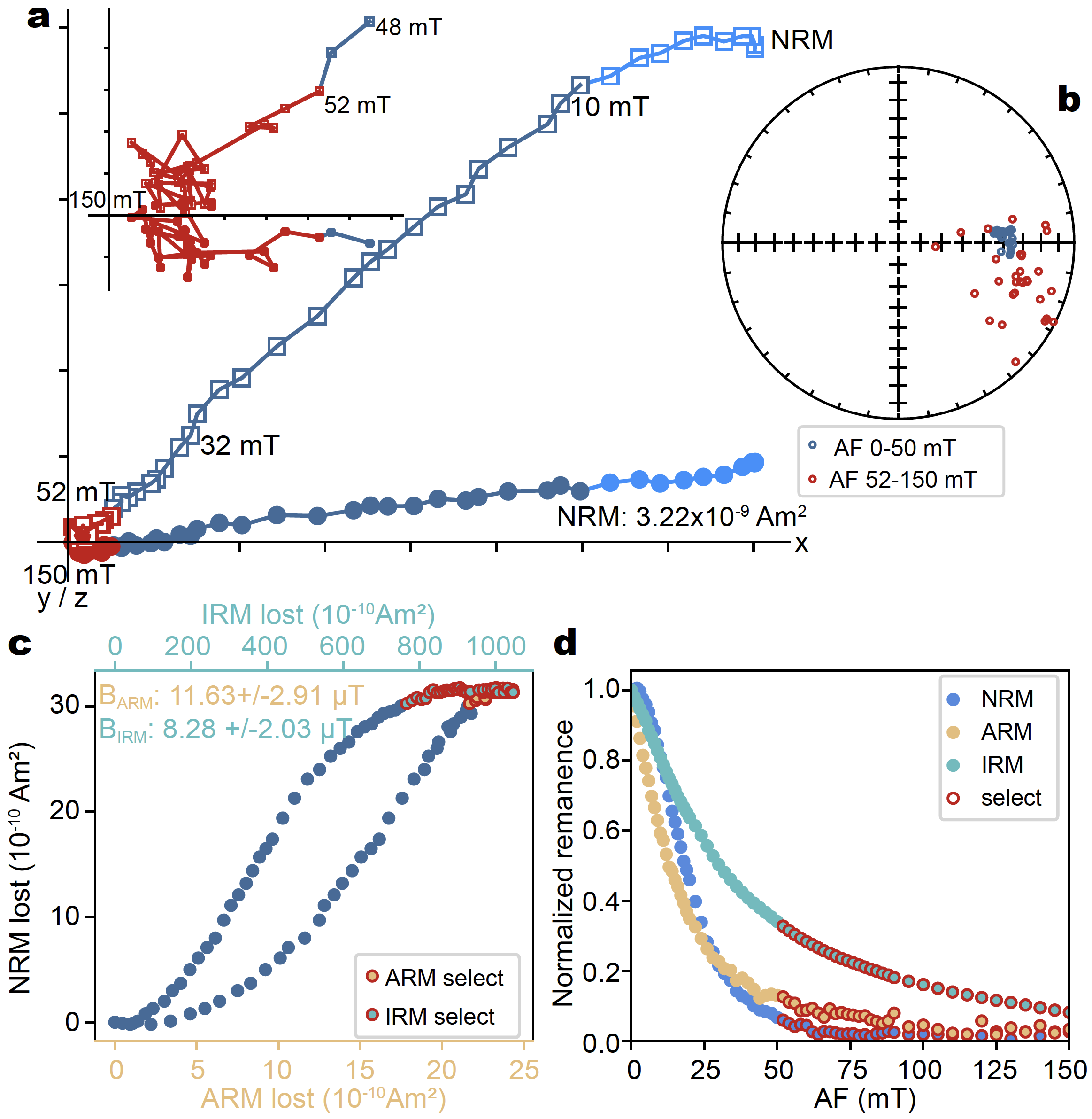 图3 嫦娥六号玄武岩样品211的古强度结果。a.逐步交变退磁的正交投影图。圆形和方形分别表示在水平和垂直平面上投影的剩磁数据,不同矫顽力组分用不同颜色表示。b.交变退磁过程中方向的等面积投影图。c.ARM和IRM校正方法古强度结果。NRM、ARM和IRM lost代表三种剩磁在交变退磁过程中的衰减量,BARM和BIRM代表ARM和IRM方法计算的古强度。d.NRM、ARM和IRM随交变退磁的衰减。a、b中的红色符号和c、d中带红色边框的符号代表用于计算古强度的数据点