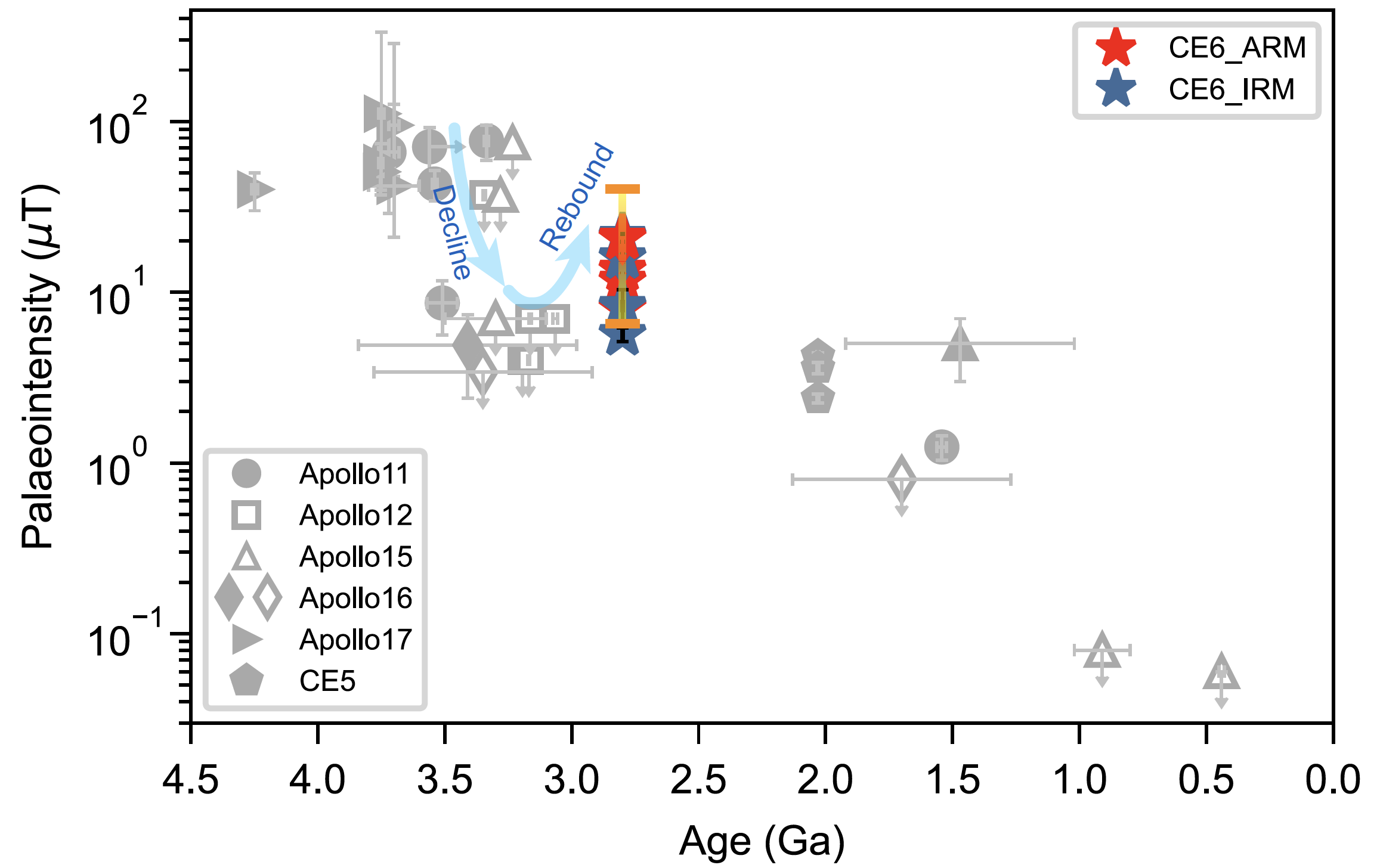 图4 月球磁场强度演化图。红色和蓝色五角星代表嫦娥六号样品ARM和IRM校正方法古强度。橙色误差棒表示对嫦娥六号古强度数据基于t分布的105次重抽样处理后的平均古强度95%置信区间(7–40 μT,中值为15 μT),计算过程考虑了线性回归和非加热古强度方法校正系数误差。空心符号代表强度值上限