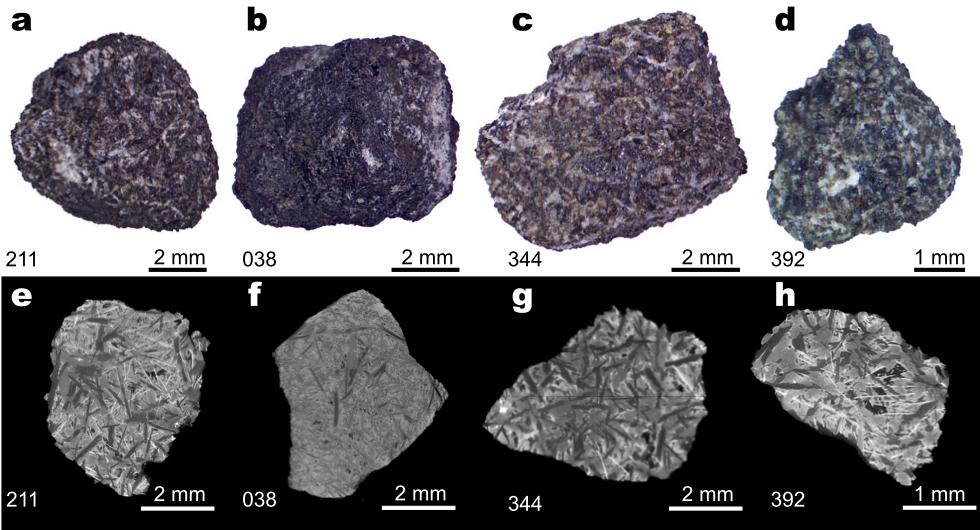 岩石磁学结果表明,嫦娥六号玄武岩样品磁化率较低,含有大量的顺磁性矿物,载磁矿物颗粒为不同粒径的混合,矫顽力分布范围较大。显微镜观察结果显示,样品211、344和392均具有微米级的铁颗粒,而样品038中的铁颗粒尺寸可能为百纳米级。岩石磁学和显微镜观测结果显示嫦娥六号玄武岩岩屑中的载磁矿物主要为铁颗粒,能够有效记录月球古磁场强度。