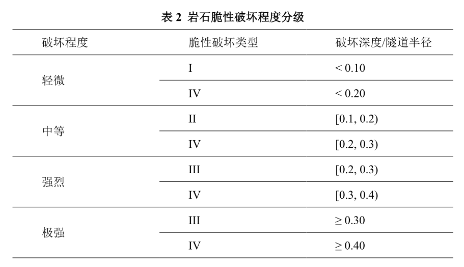 在此基础上,基于围岩破坏深度与洞室半径之比把岩石脆性破坏严重程度分为轻微、中等、强烈和极强四个等级(见表2)。
