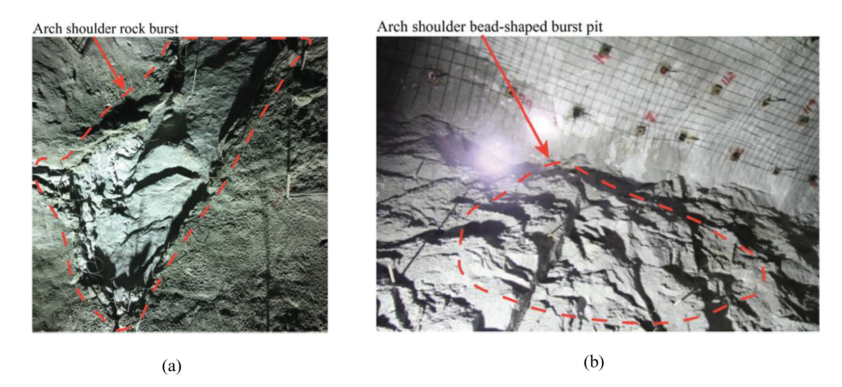 图2 双江口水电站岩石脆性破坏现场图。(a)桩号K0+890m;(b)桩号K-64m