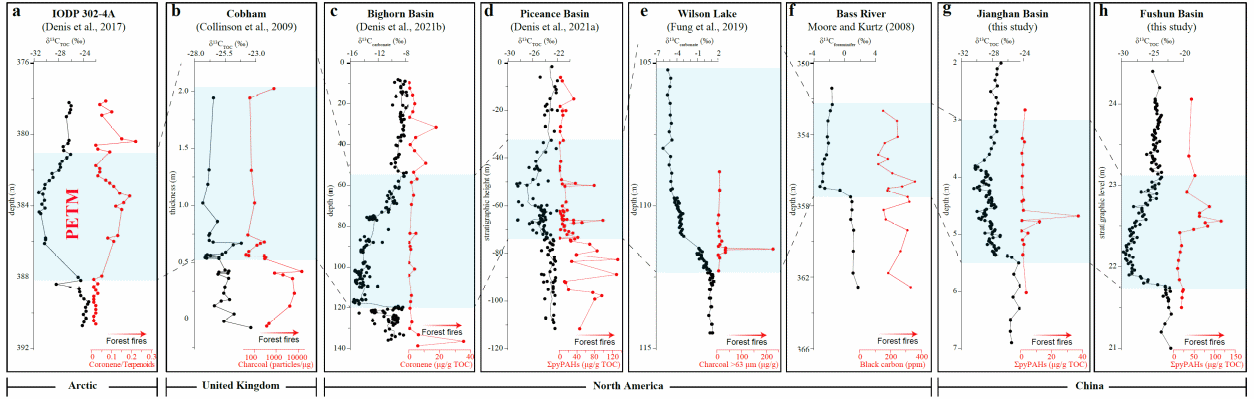 古新世-始新世极热事件(PETM)发生在距今5600万年前,是一次历时短暂、由巨量富12C的轻碳注入到海气系统所引发的快速增温事件。这次事件导致全球平均气温上升约5至8摄氏度,并引发了海洋和陆地生态系统的重大变化。野火作为一种重要的自然现象,其活动受气候变化影响显著。有学者提出,环境的剧烈变化导致古新世泥炭地的燃烧(野火假说),很可能是PETM时期轻碳的一个重要来源。此外,数值模型预测,随着全球变暖的加剧,野火活动的频率和规模预计将呈现出上升趋势。因此,系统开展PETM时期野火研究是检验野火假说和模型预测准确性的关键。然而,关于PETM期间野火活动的全球响应和区域差异,科学界尚缺乏深入了解。