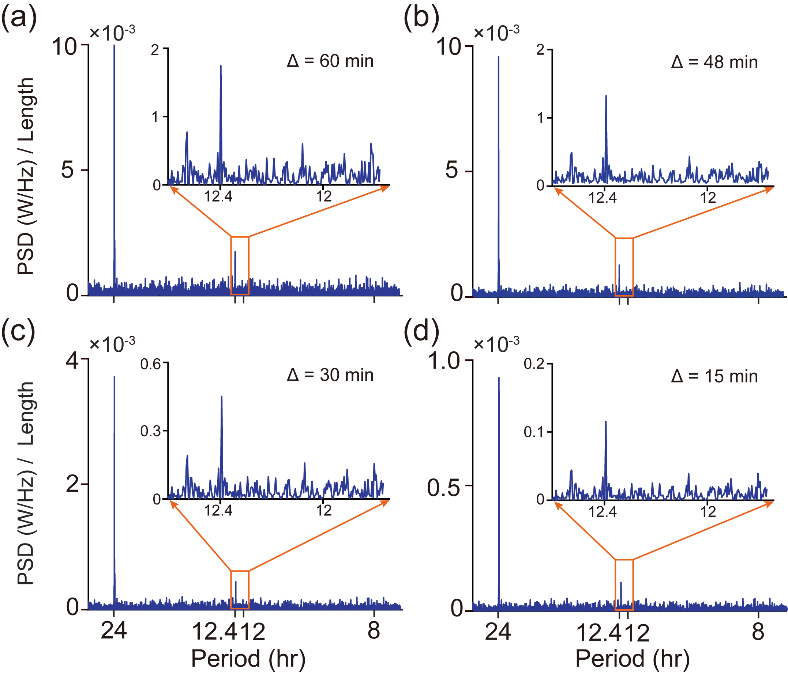 图2 不同时间间隔条件下年度平均功率谱的分析结果。(a) 60 分钟,(b) 48 分钟,(c) 30 分钟,(d) 15 分钟