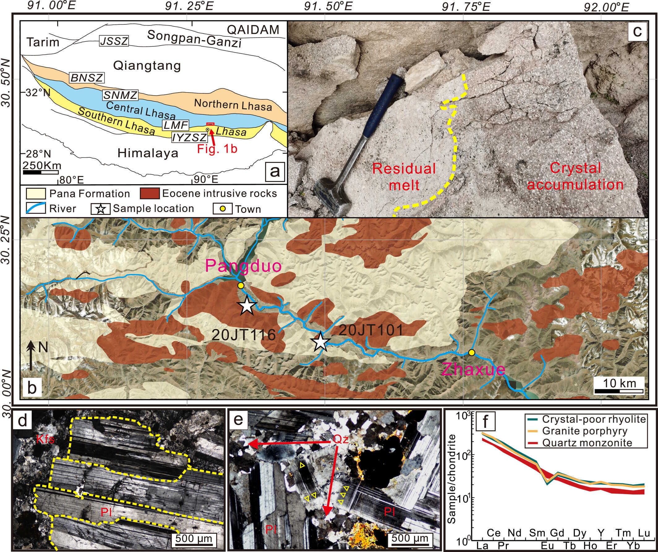 图1 区域地质图和晶体-熔体分离记录。(a)青藏高原构造框架。(b)旁多盆地区域地质图。(c)石英二长岩和花岗斑岩的接触界限。(d)显微照片显示了石英二长岩中大颗粒长石的近水平定向。(e)斜长石边部的膝折。(f)球粒陨石标准化的稀土元素配分模式图