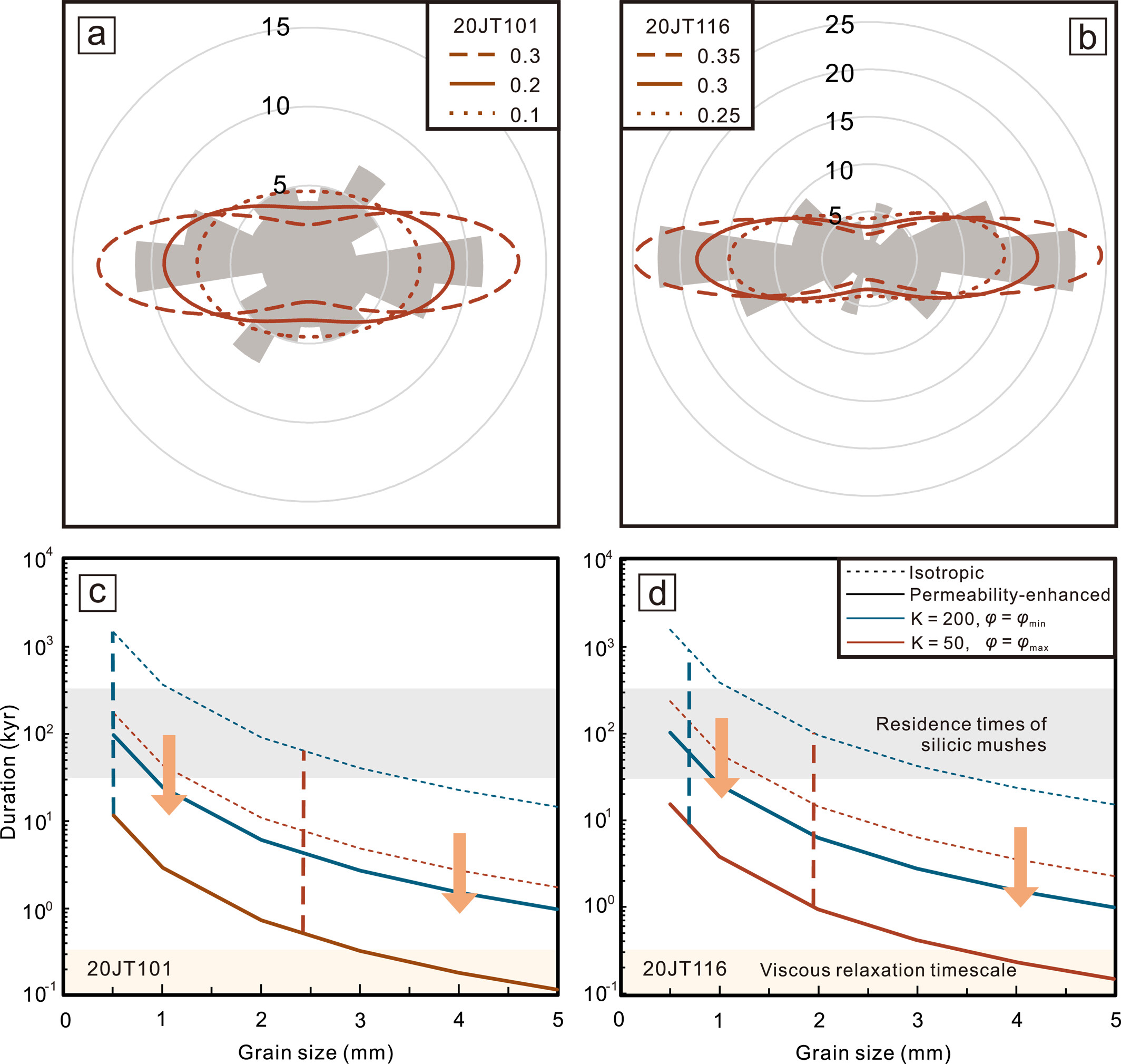 图2 压缩应变率模拟结果和压实持续时间计算结果。(a-b)通过计算长石矿物在不同应变率下从随机取向变为有序取向的过程,模拟了各种应变率下的取向概率分布。这些模拟结果与实际观察到的大颗粒长石定向情况进行了对比。最符合的压缩应变率分别为0.2 ± 0.1(20JT101)和0.3 ± 0.05(20JT116);(c-d)熔体抽离时间尺度的计算结果。通过压实将 500 米厚的熔体层与晶粥分离所需的时间。灰色区域限定了晶粥寿命。橘色区域代表地壳粘性松弛时间。蓝绿色线和红线分别是持续时间的上限和下限。垂直虚线表示样品骨架矿物的最小粒径