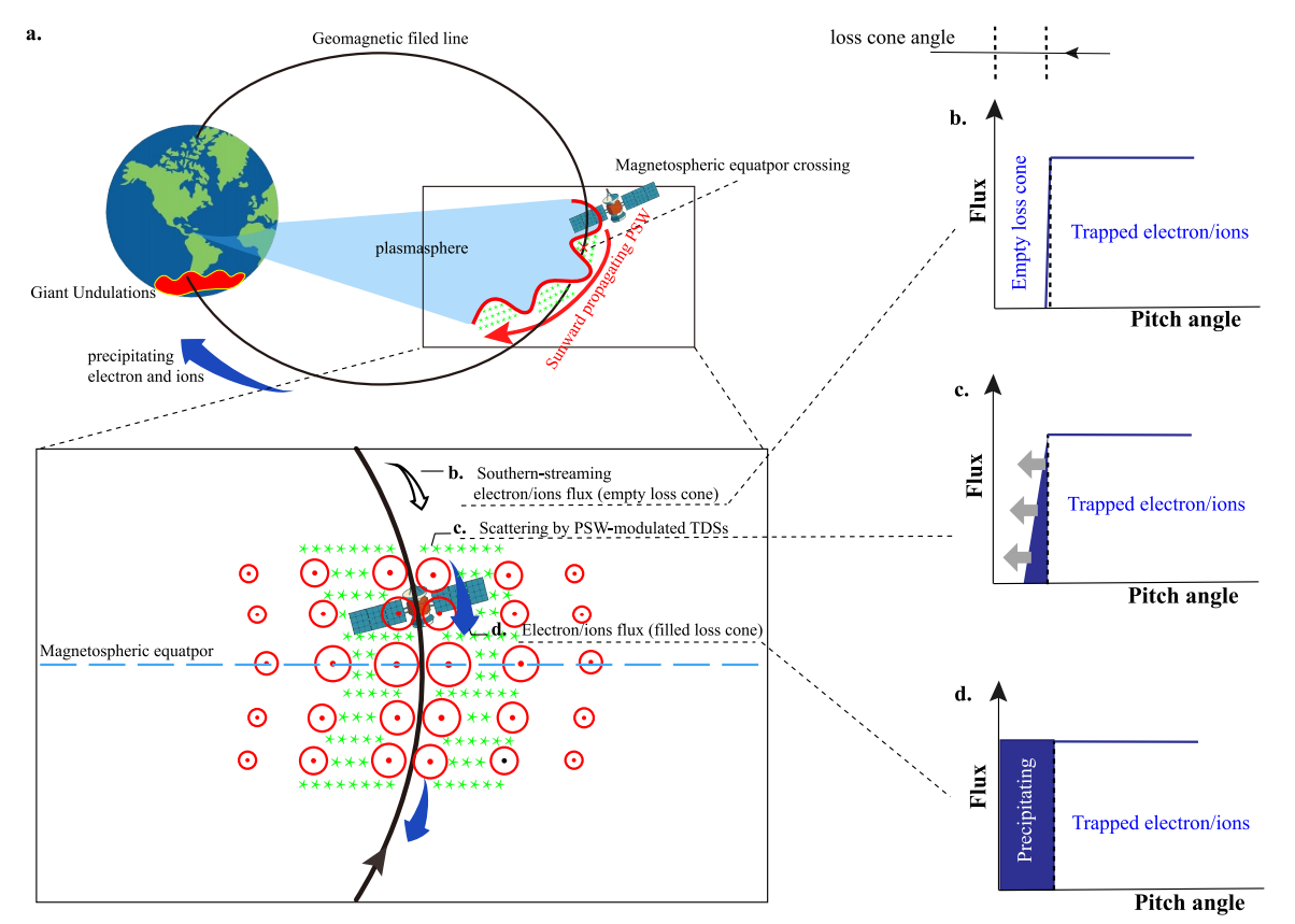 为此,800彩票行星科学与前沿技术实验室周一甲博士和何飞研究员等人,联合山东大学(威海)、中国气象局、香港大学、以及美国约翰霍普金斯大学等单位的研究人员,通过磁层-电离层共轭观测对一个中等地磁暴期间的PSWs-GUs现象进行深入分析。研究结果表明,GUs由<1keV的热电子和热离子以及几十keV的高能离子的投掷角散射沉降所直接激发的,散射电子和离子的一个PSW周期内的通量和能量能够决定GUs的尺度和亮度;而这种周期性的电子散射沉降是由PSWs调制的周期性时域结构所造成的。总结来说,昏侧PSWs通过调制时域结构的强度,进而周期性地散射和沉降粒子,最终形成电离层Gus(图1)。这种物理过程明显不同于前人的预测,凸显了PSWs-GUs背后复杂的物理机制。本研究为连接磁层PSWs和电离层GUs构建了物理机制桥梁,揭示了PSWs在磁层-电离层耦合和空间天气中扮演的关键角色。