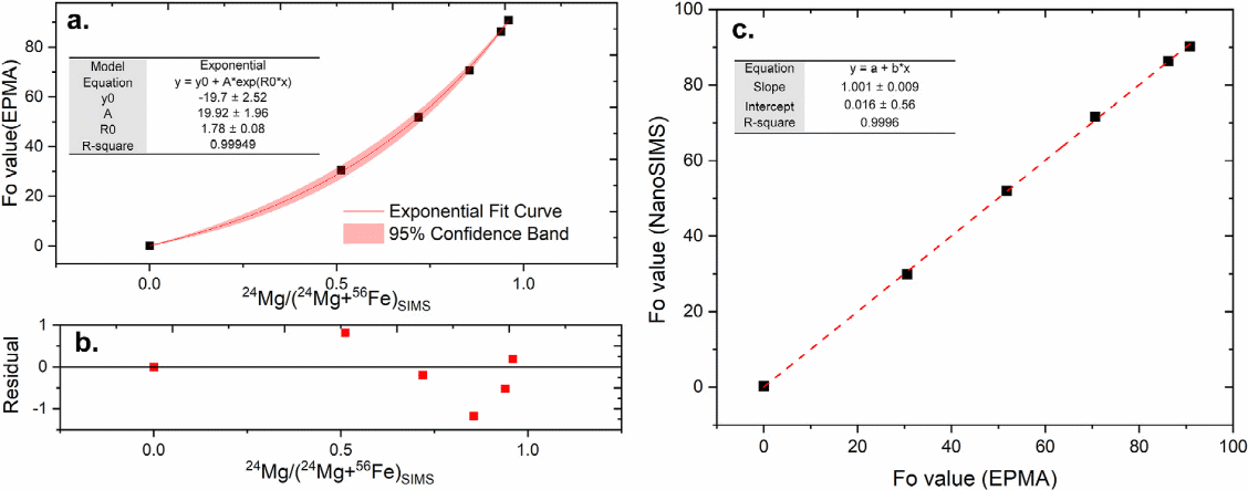 针对现存问题,800彩票纳米离子探针实验室郝佳龙高级工程师与田恒次研究员、綦超研究员等人合作,采用高温高压实验并结合地外阜康橄榄陨铁陨石等,最终成功获得了成分均一且Fo值覆盖0-90范围的橄榄石标样(图1)。在此基础上,研究团队利用CAMECA NanoSIMS 50L纳米离子探针,成功建立了橄榄石Fo值-基体效应在线校正方法,并创新性的引入了BiHill方程(图2)。该方法能够同时测定Fo值和镁同位素,大大节约了引入电子探针的时间,并且在1微米的分辨率下同位素精度还能达到0.7-0.8‰。