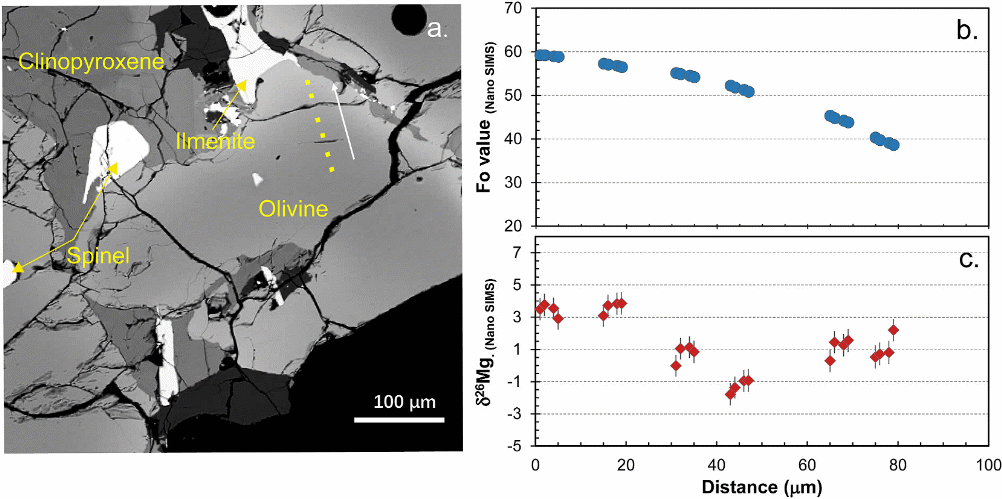 图3 (a) CE5玄武岩背散射电子(BSE)图像。分析区域的位置(黄框)和扫描路径(白线。(b)和(c)NanoSIMS测量的Fo剖面和26Mg同位素剖面