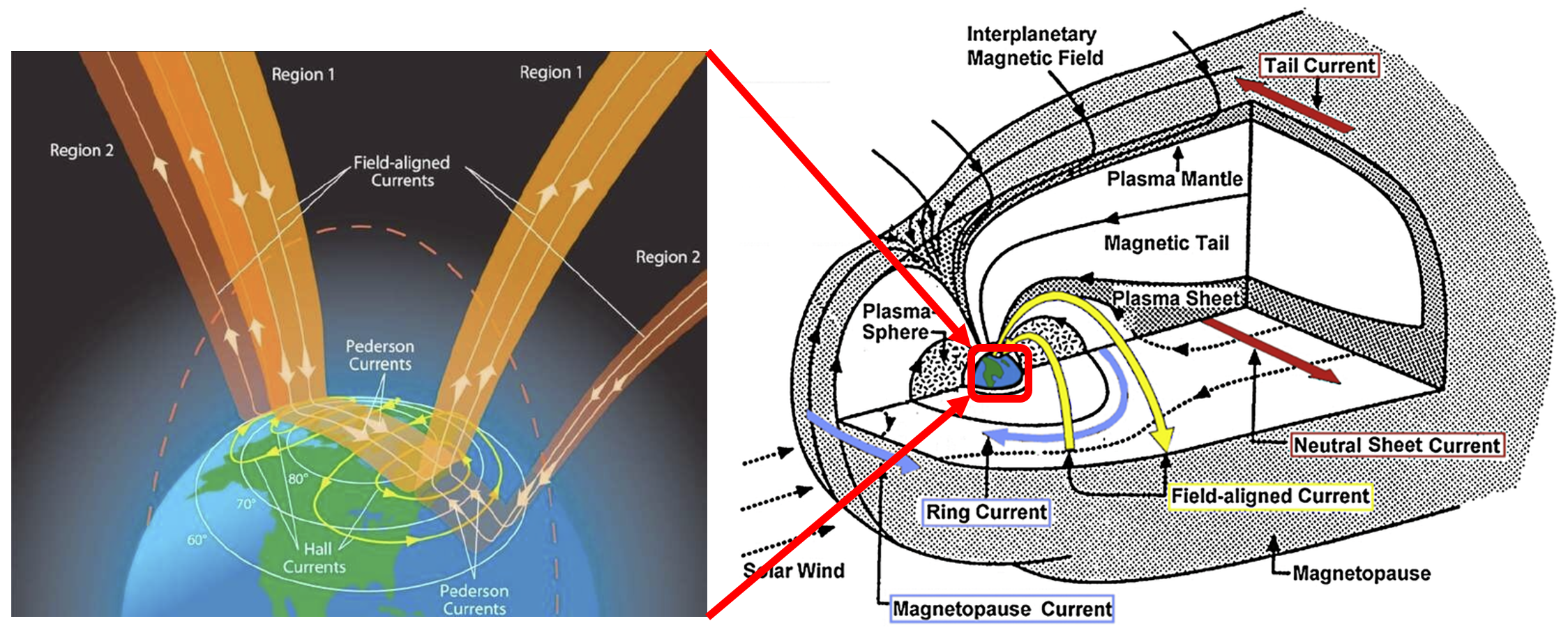地球的大尺度场向电流依据其分布形态大体可以分为三类:1区场向电流,2区场向电流,以及NBZ场向电流(图2)。地球场向电流通过电离层完成闭合。1区场向电流从晨侧流入电离层,从昏侧流出电离层;2区场向电流则分布在1区场向电流的赤道侧,它从昏侧流入电离层,从晨侧流出。NBZ场向电流在正午附近1区场向电流的极向侧,从午后流入电离层,从午前流出电离层。大量研究表明,地球场向电流的分布会显著受太阳风磁场方向的调制。
