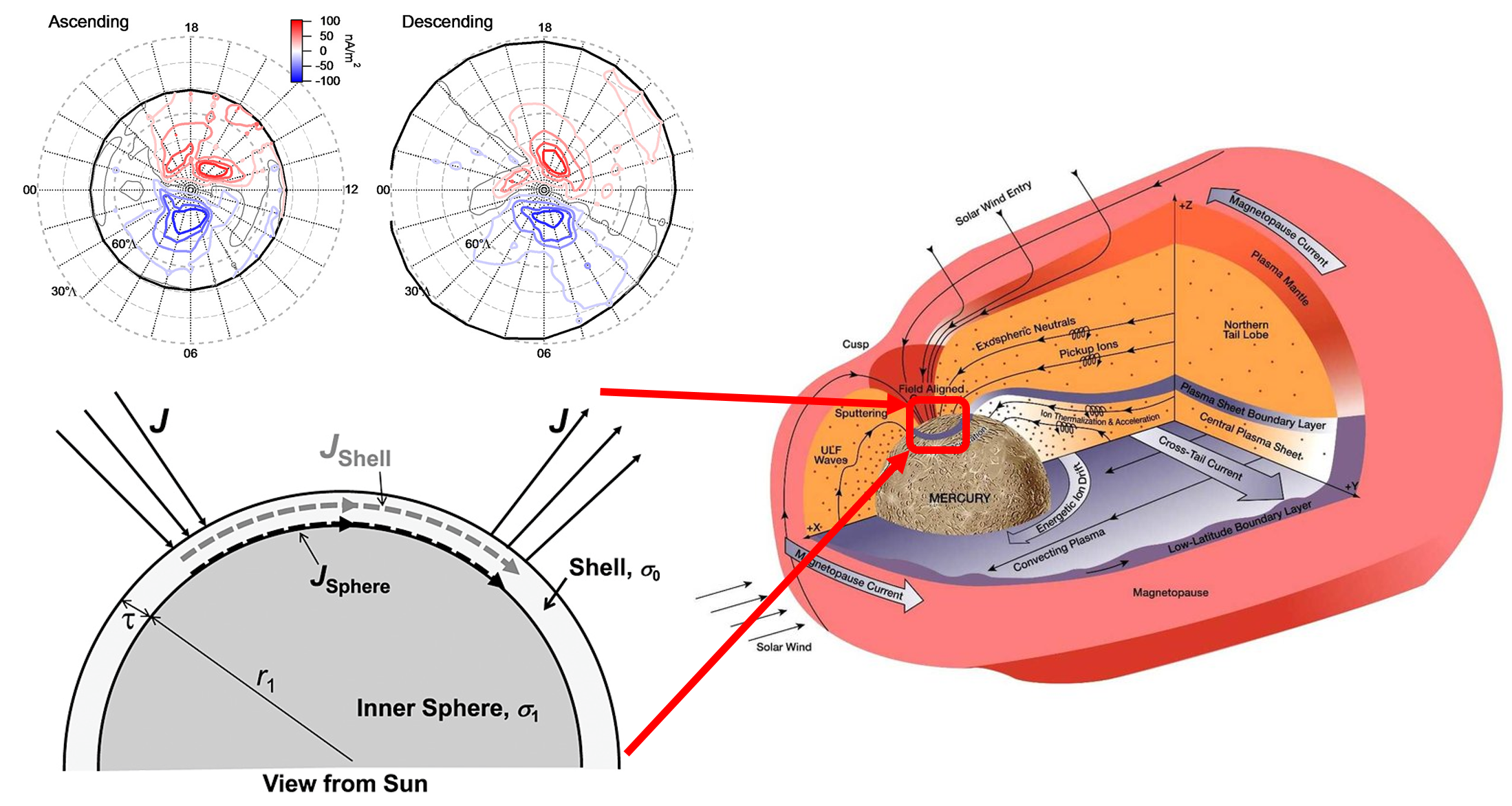 大量研究表明,水星虽具有与地球磁层类似的磁层结构,但水星本身却不具有电离层。由于缺乏电离层电流的闭合,所以长期以来人们通常认为水星不具有地球那样的大尺度场向电流。然而近年来,通过对信使号数据的统计分析,人们发现水星空间可能同样存在大尺度场向电流。为了使水星场向电流闭合,有人提出水星场向电流可穿透到行星内部,通过水星内部导电物质完成闭合(图3)。