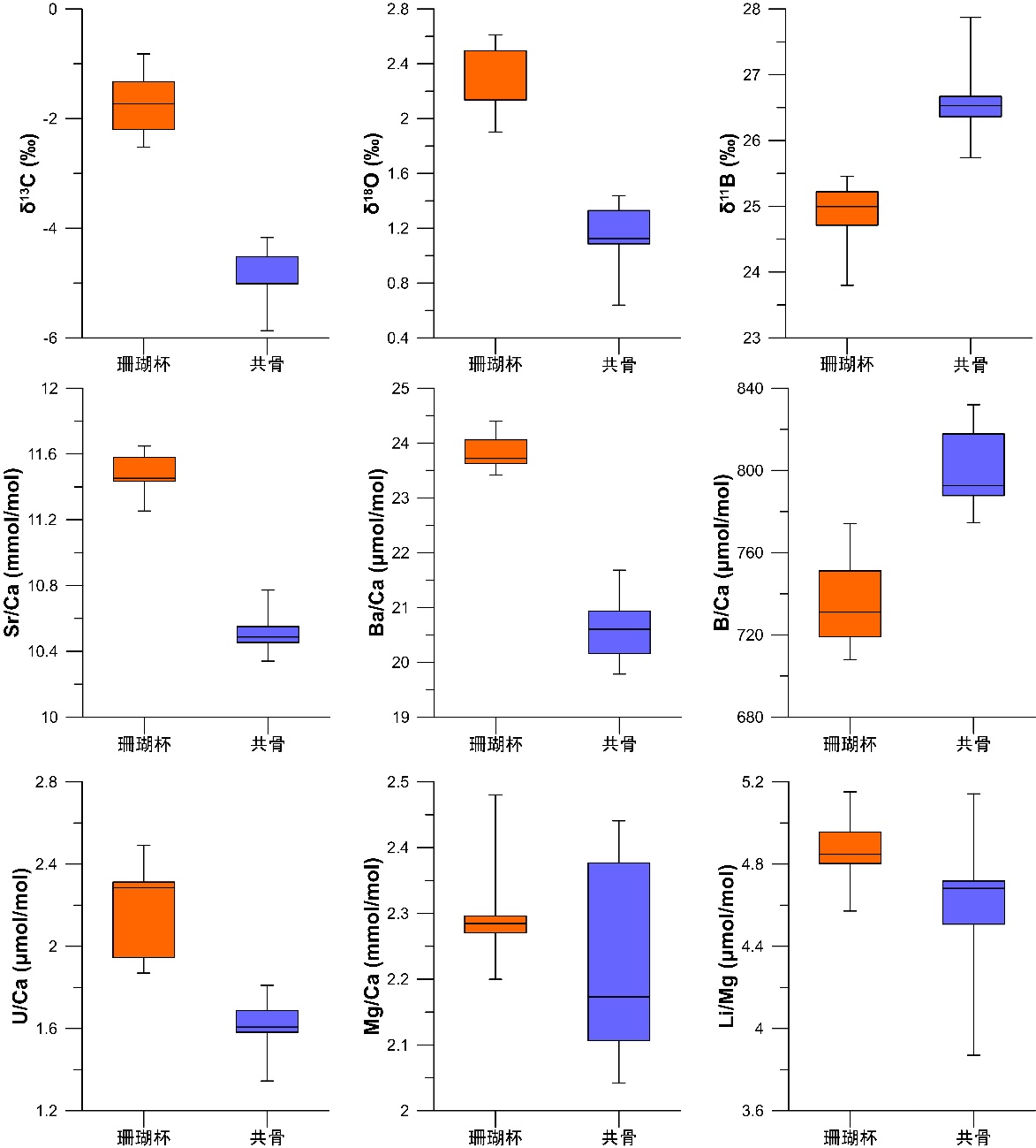 图2 冷水珊瑚(Enallopsammia sp.)珊瑚杯和共骨两种结构的地球化学指标特征