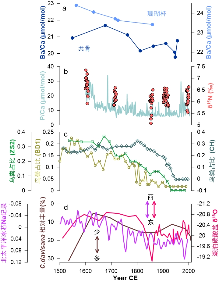 图3 近500年冷水珊瑚(Enallopsammia sp.)Ba/Ca比值变化及南海表层生产力和北太平洋通风条件对比